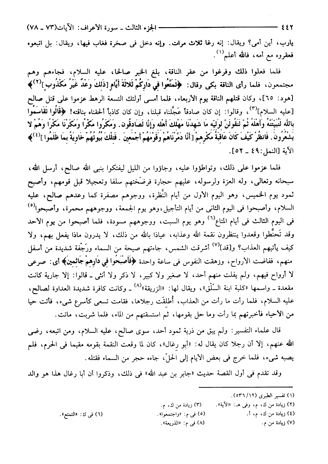 يَا رَبِّ أَيْنَ أُمِّي؟ وَيُقَالُ: إِنَّهُ رَغَا ثَلَاثَ مَرَّاتٍ. وَإِنَّهُ دَخَلَ فِي صَخْرَةٍ فَغَابَ فِيهَا، وَيُقَالُ: بَلِ اتَّبَعُوهُ فَعَقَرُوهُ مَعَ أُمِّهِ، فَاللَّهُ أَعْلَمُ (1)