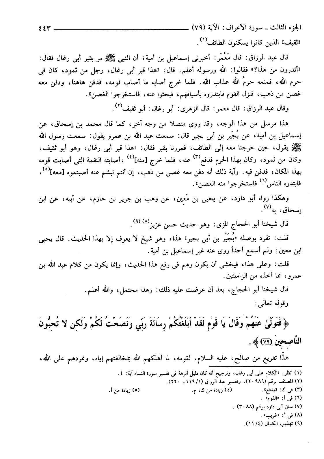 هَذَا مُرْسَلٌ مِنْ هَذَا الْوَجْهِ، وَقَدْ رُوِيَ مُتَّصِلًا مِنْ وَجْهٍ آخَرَ، كَمَا قَالَ مُحَمَّدِ بْنِ إِسْحَاقَ، عَنْ إِسْمَاعِيلَ بْنِ أُمَيَّةَ، عَنْ بُجَير بْنِ أَبِي بُجَيْرٍ قَالَ: سَمِعْتُ عَبْدَ اللَّهِ بْنَ عَمْرٍو يَقُولُ: سَمِعْتُ رَسُولَ اللَّهِ صَلَّى اللَّهُ عَلَيْهِ وَسَلَّمَ يَقُولُ، حِينَ خَرَجْنَا مَعَهُ إِلَى الطَّائِفِ، فَمَرَرْنَا بِقَبْرٍ فَقَالَ: "هَذَا قَبْرُ أَبِي رِغَالٍ، وَهُوَ أَبُو ثَقِيفٍ، وَكَانَ مِنْ ثَمُودَ، وَكَانَ بِهَذَا الْحَرَمِ فَدَفَعَ (3) عَنْهُ، فَلَمَّا خَرَجَ [مِنْهُ] (4) أَصَابَتْهُ النِّقْمَةُ الَّتِي أَصَابَتْ قَوْمَهُ بِهَذَا الْمَكَانِ، فَدُفِنَ فِيهِ. وَآيَةُ ذَلِكَ أَنَّهُ دُفِنَ مَعَهُ غصن من ذهب، إن أنتم نبشم عَنْهُ أَصَبْتُمُوهُ [مَعَهُ] (5) فَابْتَدَرَهُ النَّاسُ (6) فَاسْتَخْرَجُوا مِنْهُ الْغُصْنَ".
