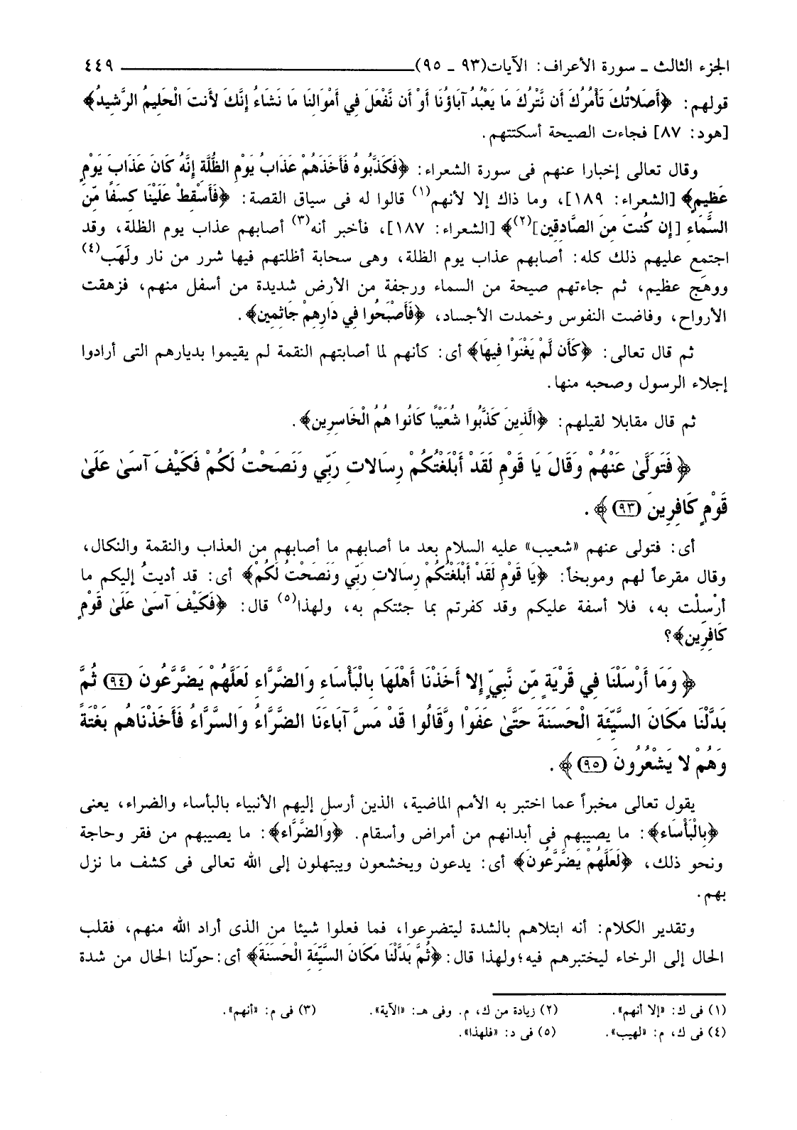 أَيْ: فَتَوَلَّى عَنْهُمْ "شُعَيْبٌ" عَلَيْهِ السَّلَامُ بَعْدَ مَا أَصَابَهُمْ مَا أَصَابَهُمْ مِنَ الْعَذَابِ وَالنِّقْمَةِ وَالنَّكَالِ، وَقَالَ مُقَرِّعًا لَهُمْ وَمُوَبِّخًا: {يَا قَوْمِ لَقَدْ أَبْلَغْتُكُمْ رِسَالاتِ رَبِّي وَنَصَحْتُ لَكُمْ} أَيْ: قَدْ أديتُ إِلَيْكُمْ مَا أُرْسِلْت بِهِ، فَلَا أسفة عليكم وقد كفرتم بما جئتم بِهِ، وَلِهَذَا (5) قَالَ: {فَكَيْفَ آسَى عَلَى قَوْمٍ كَافِرِينَ} ؟.