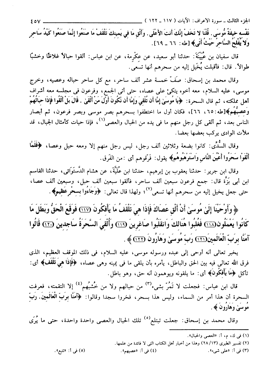 وَقَالَ ابْنُ جَرِيرٍ: حَدَّثَنَا يَعْقُوبُ بْنُ إِبْرَاهِيمَ، حَدَّثَنَا ابْنُ عُلَيَّةَ، عَنْ هِشَامٍ الدَّستَوَائي، حَدَّثَنَا الْقَاسِمُ ابْنُ أَبِي بَزَّة قَالَ: جَمَعَ فِرْعَوْنُ سَبْعِينَ أَلْفَ سَاحِرٍ، فَأَلْقَوْا سَبْعِينَ أَلْفَ حَبْلٍ، وَسَبْعِينَ أَلْفَ عَصَا، حَتَّى جَعَلَ يُخَيَّلُ إِلَيْهِ مِنْ سِحْرِهِمْ أَنَّهَا تَسْعَى (2) ؛ وَلِهَذَا قَالَ تَعَالَى: {وَجَاءُوا بِسِحْرٍ عَظِيمٍ}