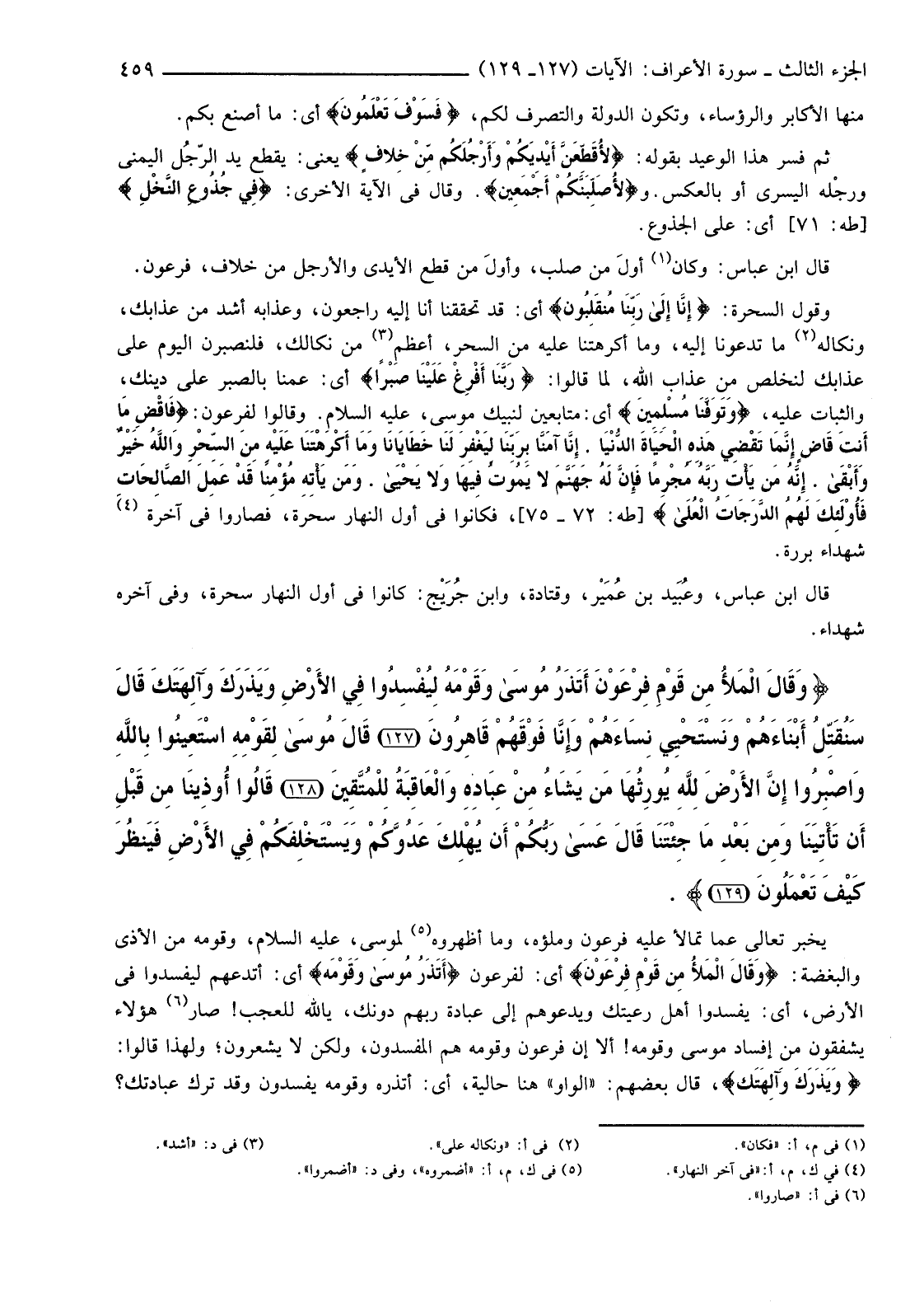 وَقَوْلُ السَّحَرَةِ: {إِنَّا إِلَى رَبِّنَا مُنْقَلِبُونَ} أَيْ: قَدْ تَحَقَّقْنَا أَنَّا إِلَيْهِ رَاجِعُونَ، وَعَذَابَهُ أَشَدُّ مِنْ عَذَابِكَ، وَنَكَالُهُ (2) مَا تَدْعُونَا إِلَيْهِ، وَمَا أَكْرَهَتْنَا عَلَيْهِ مِنَ السِّحْرِ، أَعْظَمُ (3) مِنْ نَكَالِكَ، فَلَنَصْبِرَنَّ الْيَوْمَ عَلَى عَذَابِكَ لِنَخْلُصَ مِنْ عَذَابِ اللَّهِ، لَمَّا قَالُوا: {رَبَّنَا أَفْرِغْ عَلَيْنَا صَبْرًا} أَيْ: عُمَّنَا بِالصَّبْرِ عَلَى دِينِكَ، وَالثَّبَاتِ عَلَيْهِ، {وَتَوَفَّنَا مُسْلِمِينَ} أَيْ: مُتَابِعِينَ لِنَبِيِّكَ مُوسَى، عَلَيْهِ السَّلَامُ. وَقَالُوا لِفِرْعَوْنَ: {فَاقْضِ مَا أَنْتَ قَاضٍ إِنَّمَا تَقْضِي هَذِهِ الْحَيَاةَ الدُّنْيَا * إِنَّا آمَنَّا بِرَبِّنَا لِيَغْفِرَ لَنَا خَطَايَانَا وَمَا أَكْرَهْتَنَا عَلَيْهِ مِنَ السِّحْرِ وَاللَّهُ خَيْرٌ وَأَبْقَى * إِنَّهُ مَنْ يَأْتِ رَبَّهُ مُجْرِمًا فَإِنَّ لَهُ جَهَنَّمَ لَا يَمُوتُ فِيهَا وَلا يَحْيَا * وَمَنْ يَأْتِهِ مُؤْمِنًا قَدْ عَمِلَ الصَّالِحَاتِ فَأُولَئِكَ لَهُمُالدَّرَجَاتُ الْعُلا} [طه:72-75] فَكَانُوا فِي أَوَّلِ النَّهَارِ سَحَرَةً، فَصَارُوا فِي آخِرِهِ (4) شُهَدَاءَ بَرَرَةً.