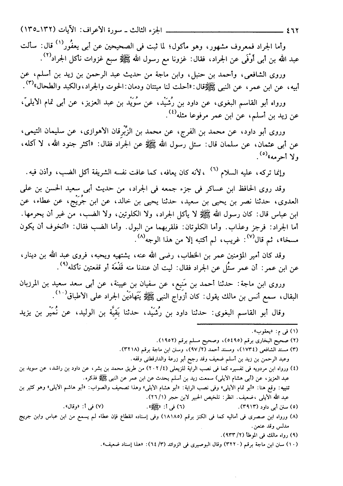 وَأَمَّا الْجَرَادُ فَمَعْرُوفٌ مَشْهُورٌ، وَهُوَ مَأْكُولٌ؛ لِمَا ثَبَتَ فِي الصَّحِيحَيْنِ عَنْ أَبِي يعفُور (1) قَالَ: سَأَلْتُ عَبْدَ اللَّهِ بْنَ أَبِي أَوْفَى عَنِ الْجَرَادِ، فَقَالَ: غَزَوْنَا مَعَ رَسُولِ اللَّهِ صَلَّى اللَّهُ عَلَيْهِ وَسَلَّمَ سَبْعَ غَزَوَاتٍ نَأْكُلُ الْجَرَادَ (2)