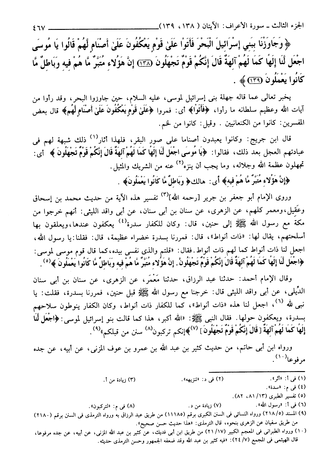 وَرَوَى الْإِمَامُ أَبُو جَعْفَرِ بْنُ جَرِيرٍ [رَحِمَهُ اللَّهُ] (3) تَفْسِيرَ هَذِهِ الْآيَةِ مِنْ حَدِيثِ مُحَمَّدِ بْنِ إِسْحَاقَ وعَقِيل، وَمَعْمَرٍ كُلِّهِمْ، عَنِ الزُّهْرِيِّ، عَنْ سِنَانِ بْنِ أَبِي سِنَانٍ، عَنْ أَبِي وَاقِدٍ اللَّيْثِيِّ: أَنَّهُمْ خَرَجُوا مِنْ مَكَّةَ مَعَ رَسُولِ اللَّهِ صَلَّى اللَّهُ عَلَيْهِ وَسَلَّمَ إِلَى حُنَيْنٍ، قَالَ: وَكَانَ لِلْكُفَّارِ سِدْرَةٌ (4) يَعْكُفُونَ عِنْدَهَا، وَيُعَلِّقُونَ بِهَا أَسْلِحَتَهُمْ، يُقَالُ لَهَا: "ذَاتُ أَنْوَاطٍ"، قَالَ: فَمَرَرْنَا بِسِدْرَةٍ خَضْرَاءَ عَظِيمَةٍ، قَالَ: فَقُلْنَا: يَا رَسُولَ اللَّهِ، اجْعَلْ لَنَا ذَاتَ أَنْوَاطٍ كَمَا لَهُمْ ذَاتُ أَنْوَاطٍ. فَقَالَ: "قُلْتُمْ وَالَّذِي نَفْسِي بِيَدِهِ، كَمَا قَالَ قَوْمُ مُوسَى لِمُوسَى: {اجْعَلْ لَنَا إِلَهًا كَمَا لَهُمْ آلِهَةٌ قَالَ إِنَّكُمْ قَوْمٌ تَجْهَلُونَ. إِنَّ هَؤُلاءِ مُتَبَّرٌ مَا هُمْ فِيهِ وَبَاطِلٌ مَا كَانُوا يَعْمَلُونَ} (5)