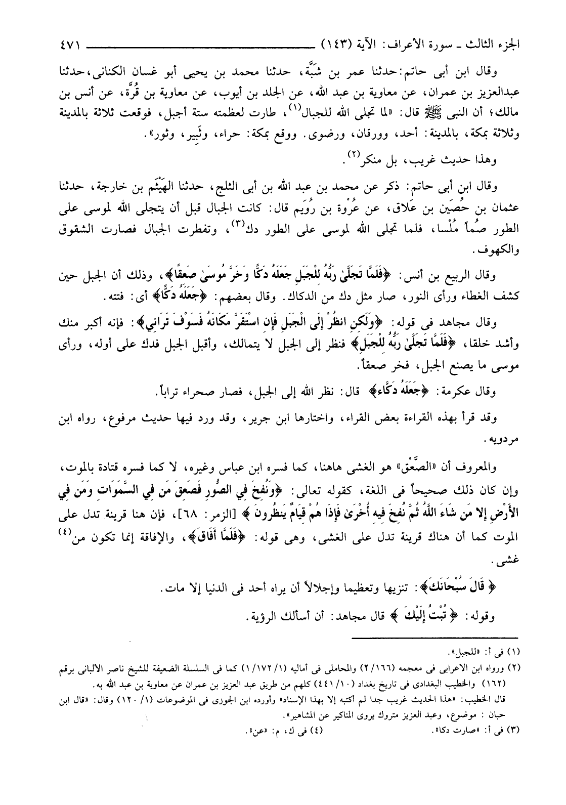وَقَالَ ابْنُ أَبِي حَاتِمٍ: حَدَّثَنَا عُمَرُ بْنُ شَبَّة، حَدَّثَنَا مُحَمَّدُ بْنُ يَحْيَى أَبُو غَسَّانَ الْكِنَانِيُّ، حَدَّثَنَا عَبْدُ الْعَزِيزِ بْنُ عِمْرَانَ، عَنْ مُعَاوِيَةَ بْنِ عَبْدِ اللَّهِ، عَنِ الْجَلْدِ بْنِ أيوب، عَنْ مُعَاوِيَةَ بْنِ قُرَّة، عَنْ أَنَسِ بْنِ مَالِكٍ؛ أَنَّ النَّبِيَّ صَلَّى اللَّهُ عَلَيْهِ وَسَلَّمَ قَالَ: "لَمَّا تَجَلَّى اللَّهُ لِلْجِبَالِ (1) طَارَتْ لِعَظَمَتِهِ سِتَّةُ أَجْبُلٍ، فَوَقَعَتْ ثَلَاثَةٌ بِالْمَدِينَةِ وَثَلَاثَةٌ بِمَكَّةَ، بِالْمَدِينَةِ: أُحُدٌ، وَوَرْقَانُ، وَرَضْوَى. وَوَقَعَ بِمَكَّةَ: حِرَاءٌ، وثَبِير، وَثَوْرٌ".