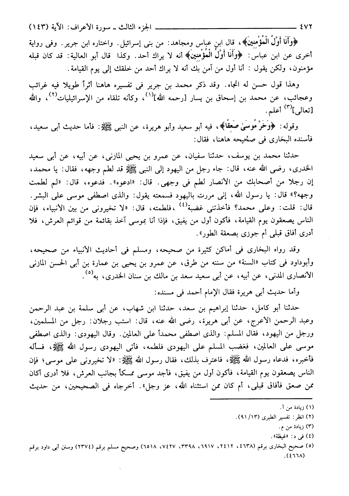 وَقَوْلُهُ: {وَخَرَّ مُوسَى صَعِقًا} فيه أبو سَعِيدٍ وَأَبِي هُرَيْرَةَ، عَنِ النَّبِيِّ صَلَّى اللَّهُ عَلَيْهِ وَسَلَّمَ فَأَمَّا حَدِيثُ أَبِي سَعِيدٍ، فَأَسْنَدَهُ الْبُخَارِيُّ فِي صَحِيحِهِ هَاهُنَا، فَقَالَ:
