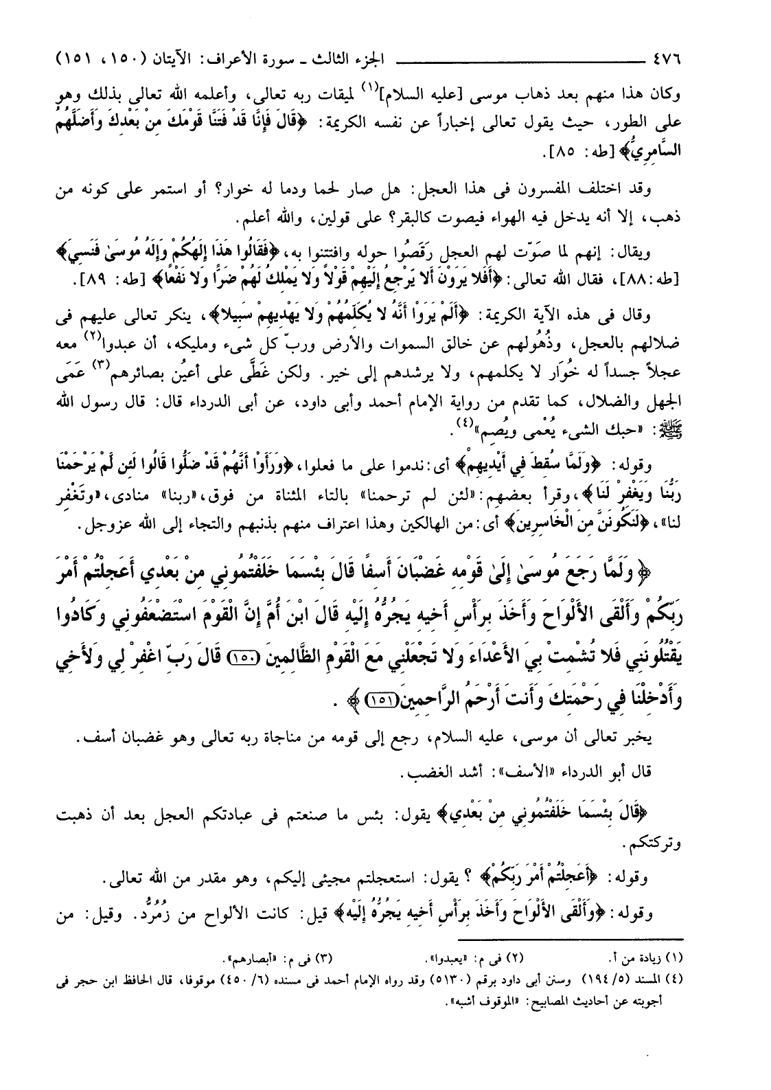{وَلَمَّا رَجَعَ مُوسَى إِلَى قَوْمِهِ غَضْبَانَ أَسِفًا قَالَ بِئْسَمَا خَلَفْتُمُونِي مِنْ بَعْدِي أَعَجِلْتُمْ أَمْرَ رَبِّكُمْ وَأَلْقَى الألْوَاحَ وَأَخَذَ بِرَأْسِ أَخِيهِ يَجُرُّهُ إِلَيْهِ قَالَ ابْنَ أُمَّ إِنَّ الْقَوْمَ اسْتَضْعَفُونِي وَكَادُوا يَقْتُلُونَنِي فَلا تُشْمِتْ بِيَ الأعْدَاءَ وَلا تَجْعَلْنِي مَعَ الْقَوْمِ الظَّالِمِينَ (150) قَالَ رَبِّ اغْفِرْ لِي وَلأخِي وَأَدْخِلْنَا فِي رَحْمَتِكَ وَأَنْتَ أَرْحَمُ الرَّاحِمِينَ (151) }