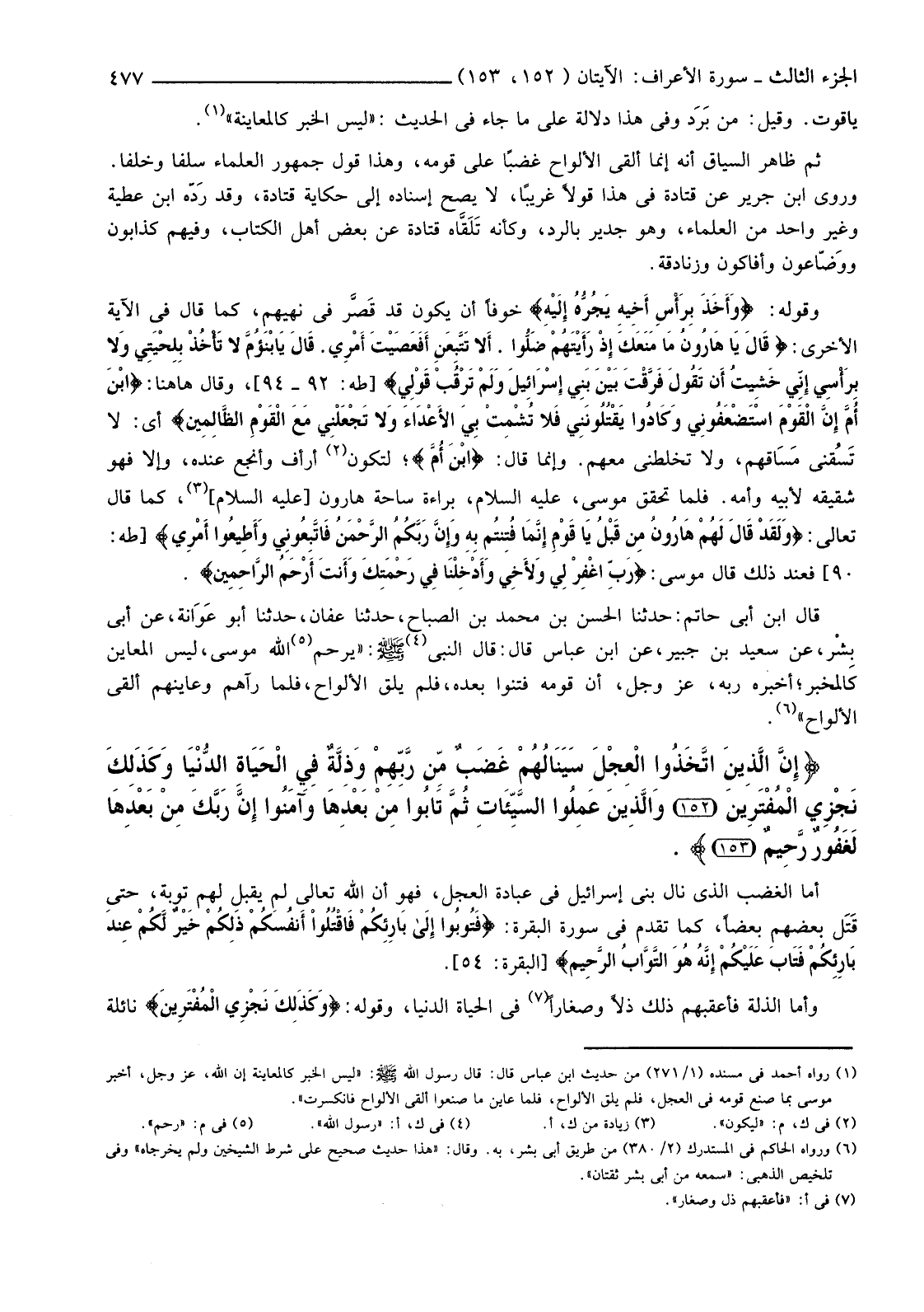 قَالَ ابْنُ أَبِي حَاتِمٍ: حَدَّثَنَا الْحَسَنُ بْنُ مُحَمَّدِ بْنِ الصَّبَاحِ، حَدَّثَنَا عَفَّانُ، حَدَّثَنَا أَبُو عَوَانة، عَنْ أَبِي بِشْر، عَنْ سَعِيدِ بْنِ جُبَيْرٍ، عَنِ ابْنِ عَبَّاسٍ قَالَ: قَالَ النَّبِيُّ (4) صَلَّى اللَّهُ عَلَيْهِ وَسَلَّمَ "يَرْحَمُ (5) اللَّهُ مُوسَى، لَيْسَ الْمُعَايِنُ كَالْمُخْبَرِ؛ أَخْبَرَهُ رَبُّهُ، عَزَّ وَجَلَّ، أَنَّ قَوْمَهُ فُتِنُوا بَعْدَهُ، فَلَمْ يُلْقِ الْأَلْوَاحَ، فَلَمَّا رَآهُمْ وَعَايَنَهُمْ أَلْقَى الْأَلْوَاحَ" (6)