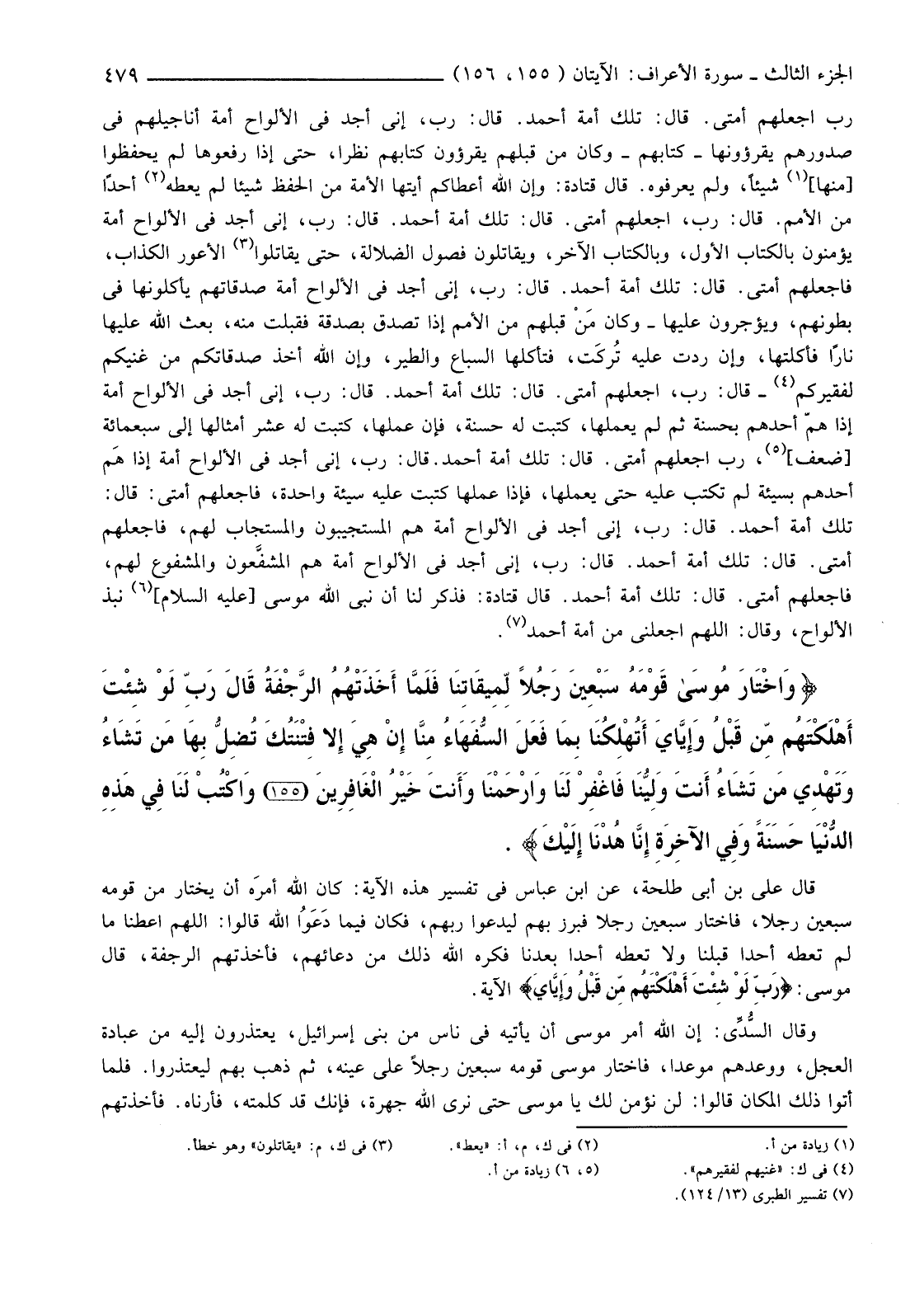 رَبِّ اجْعَلْهُمْ أُمَّتِي. قَالَ: تِلْكَ أُمَّةُ أَحْمَدَ. قَالَ: رَبِّ، إِنِّي أَجِدُ فِي الْأَلْوَاحِ أُمَّةً أَنَاجِيلُهُمْ فِي صُدُورِهِمْ يَقْرَءُونَهَا -كِتَابَهُمْ -وَكَانَ مَنْ قَبْلَهُمْ يَقْرَءُونَ كِتَابَهُمْ نَظَرًا، حَتَّى إِذَا رَفَعُوهَا لَمْ يَحْفَظُوا [مِنْهَا] (1) شَيْئًا، وَلَمْ يَعْرِفُوهُ. قَالَ قَتَادَةُ: وَإِنَّ اللَّهَ أَعْطَاهُمْ أَيَّتُهَا الْأُمَّةُ مِنَ الْحِفْظِ شَيْئًا لَمْ يُعْطِهِ (2) أَحَدًا مِنَ الْأُمَمِ. قَالَ: رَبِّ، اجْعَلْهُمْ أُمَّتِي. قَالَ: تِلْكَ أُمَّةُ أَحْمَدَ. قَالَ: رَبِّ، إِنِّي أَجِدُ فِي الْأَلْوَاحِ أُمَّةً يُؤْمِنُونَ بِالْكِتَابِ الْأَوَّلِ، وَبِالْكِتَابِ الْآخِرِ، وَيُقَاتِلُونَ فُصُولَ الضَّلَالَةِ، حَتَّى يُقَاتِلُوا (3) الْأَعْوَرَ الْكَذَّابَ، فَاجْعَلْهُمْ أُمَّتِي. قَالَ: تِلْكَ أُمَّةُ أَحْمَدَ. قَالَ: رَبِّ، إِنِّي أَجِدُ فِي الْأَلْوَاحِ أُمَّةً صَدَقَاتُهُمْ يَأْكُلُونَهَا فِي بُطُونِهِمْ، وَيُؤْجَرُونَ عَلَيْهَا -وَكَانَ مَنْ قَبْلَهُمْ مِنَ الْأُمَمِ إِذَا تَصَدَّقَ بِصَدَقَةٍ فَقَبِلَتْ مِنْهُ، بَعَثَ اللَّهُ عَلَيْهَا نَارًا فَأَكَلَتْهَا، وَإِنْ رُدَّتْ عَلَيْهِ تُركَت، فَتَأْكُلُهَا السِّبَاعُ وَالطَّيْرُ، وَإِنَّ اللَّهَ أَخَذَ صَدَقَاتِكُمْ مِنْ غَنِيِّكُمْ لِفَقِيرِكُمْ (4) -قَالَ: رَبِّ، اجْعَلْهُمْ أُمَّتِي. قَالَ: تِلْكَ أُمَّةُ أَحْمَدَ. قَالَ رَبِّ، إِنِّي أَجِدُ فِي الْأَلْوَاحِ أُمَّةً إِذَا هَمَّ أَحَدُهُمْ بِحَسَنَةٍ ثُمَّ لَمْ يَعْمَلْهَا، كُتِبَتْ لَهُ حَسَنَةٌ، فَإِنْ عَمِلَهَا، كُتِبَتْ لَهُ عَشْرُ أَمْثَالِهَا إِلَى سَبْعِمِائَةِ [ضِعْفٍ] (5) رَبِّ اجْعَلْهُمْ أُمَّتِي. قَالَ: تِلْكَ أُمَّةُ أَحْمَدَ. قَالَ: رَبِّ، إِنِّي أَجِدُ فِي الْأَلْوَاحِ أُمَّةً إِذَا هَم أَحَدُهُمْ بِسَيِّئَةٍ لَمْ تُكْتَبْ عَلَيْهِ حَتَّى يَعْمَلَهَا، فَإِذَا عَمِلَهَا كُتِبَتْ عَلَيْهِ سَيِّئَةٌ وَاحِدَةٌ، فَاجْعَلْهُمْ أُمَّتِي: قَالَ: تِلْكَ أُمَّةُ أَحْمَدَ. قَالَ: رَبِّ، إِنِّي أَجِدُ فِي الْأَلْوَاحِ أُمَّةً هُمُ الْمُسْتَجِيبُونَ وَالْمُسْتَجَابُ لَهُمْ، فَاجْعَلْهُمْ أُمَّتِي. قَالَ: تِلْكَ أُمَّةُ أَحْمَدَ. قَالَ: رَبِّ، إِنِّي أَجِدُ فِي الْأَلْوَاحِ أُمَّةً هُمُ المشفَّعون وَالْمَشْفُوعُ لَهُمْ، فَاجْعَلْهُمْ أُمَّتِي. قَالَ: تِلْكَ أُمَّةُ أَحْمَدَ. قَالَ: قَتَادَةُ فَذُكِرَ لَنَا أَنَّ نَبِيَّ اللَّهِ مُوسَى [عَلَيْهِ السَّلَامُ] (6) نَبَذَ الْأَلْوَاحَ، وَقَالَ اللَّهُمَّ اجْعَلْنِي مِنْ أُمَّةِ أَحْمَدَ (7)