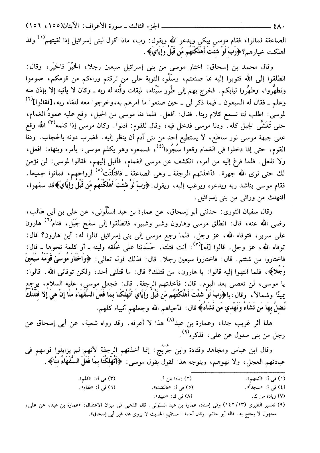 وَقَالَ سُفْيَانُ الثَّوْرِيُّ: حَدَّثَنِي أَبُو إِسْحَاقَ، عَنْ عُمَارَةَ بْنِ عَبْدٍ السَّلُولي، عَنْ عَلِيِّ بْنِ أَبِي طَالِبٍ، رَضِيَ اللَّهُ عَنْهُ، قَالَ: انْطَلَقَ مُوسَى وَهَارُونُ وَشَبَّرُ وَشَبِيرُ، فَانْطَلَقُوا إِلَى سَفْحِ جَبَل، فَنَامَ (6) هَارُونُ عَلَى سَرِيرٍ، فَتَوَفَّاهُ اللَّهُ، عَزَّ وَجَلَّ. فَلَمَّا رَجَعَ مُوسَى إِلَى بَنِي إِسْرَائِيلَ قَالُوا لَهُ: أَيْنَ هَارُونُ؟ قَالَ: تَوَفَّاهُ اللَّهُ، عَزَّ وَجَلَّ. قَالُوا [لَهُ] (7) أَنْتَ قَتَلْتَهُ، حَسَدتنا عَلَى خُلقه وَلِينِهِ -أَوْ كَلِمَةٍ نَحْوَهَا -قَالَ: فَاخْتَارُوا مَنْ شِئْتُمْ. قَالَ: فَاخْتَارُوا سَبْعِينَ رَجُلًا. قَالَ: فَذَلِكَ قَوْلُهُ تَعَالَى: {وَاخْتَارَ مُوسَى قَوْمَهُ سَبْعِينَ رَجُلا} فَلَمَّا انْتَهَوْا إِلَيْهِ قَالُوا: يَا هَارُونُ، مَنْ قَتَلَكَ؟ قَالَ: مَا قَتَلَنِي أَحَدٌ، وَلَكِنْ تَوَفَّانِي اللَّهُ. قَالُوا: يَا مُوسَى، لَنْ تُعْصَى بَعْدَ الْيَوْمِ. قَالَ: فَأَخَذَتْهُمُ الرَّجْفَةُ. قَالَ: فَجَعَلَ مُوسَى، عَلَيْهِ السَّلَامُ، يُرْجِعُ يَمِينًا وَشِمَالًا وَقَالَ: يَا {رَبِّ لَوْ شِئْتَ أَهْلَكْتَهُمْ مِنْ قَبْلُ وَإِيَّايَ أَتُهْلِكُنَا بِمَا فَعَلَ السُّفَهَاءُ مِنَّا إِنْ هِيَ إِلا فِتْنَتُكَ تُضِلُّ بِهَا مَنْ تَشَاءُ وَتَهْدِي مَنْ تَشَاءُ} قَالَ: فَأَحْيَاهُمُ اللَّهُ وَجَعَلَهُمْ أَنْبِيَاءَ كُلَّهُمْ.