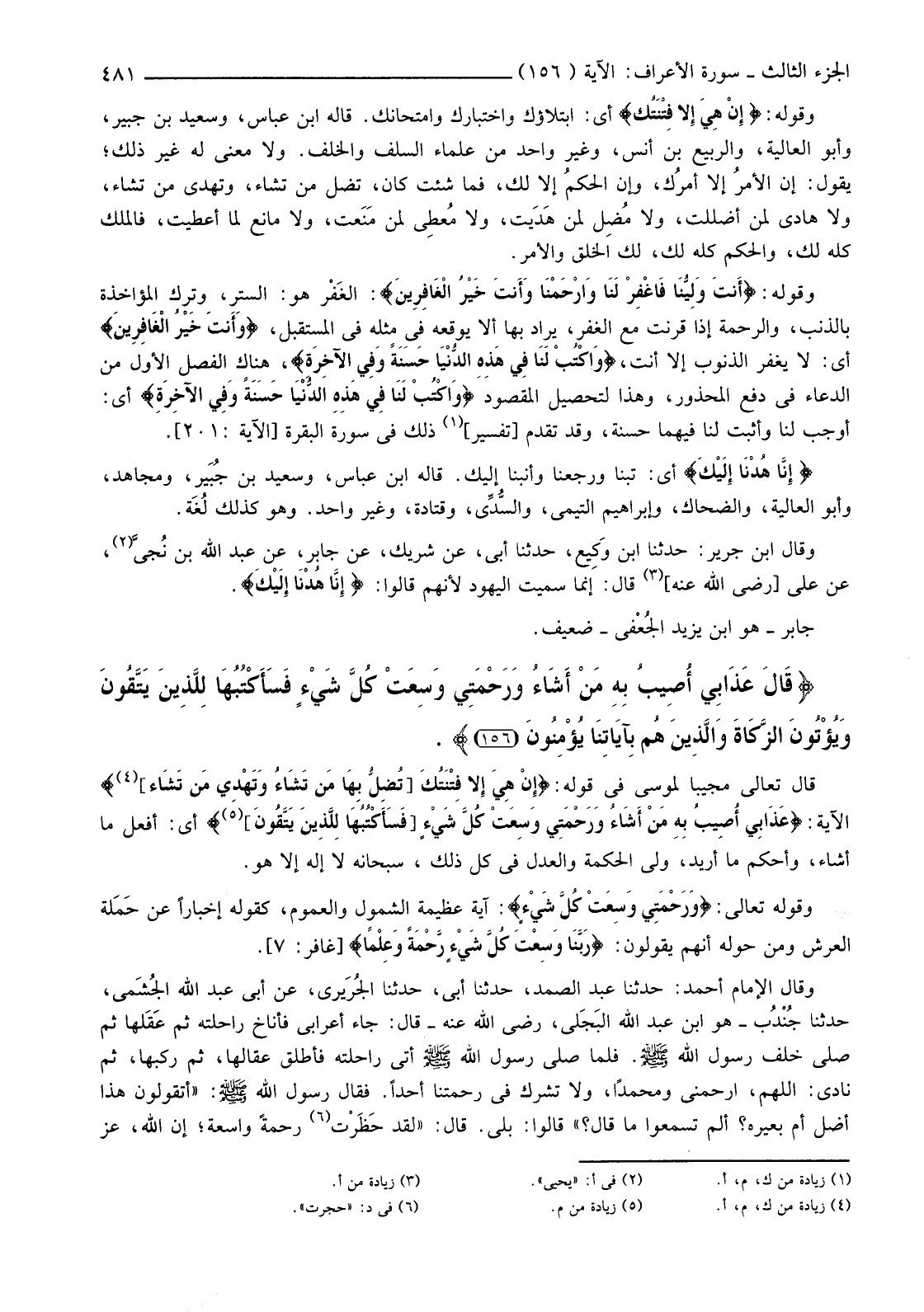 وَقَوْلُهُ: {إِنْ هِيَ إِلا فِتْنَتُكَ} أَيِ: ابْتِلَاؤُكَ وَاخْتِبَارُكَ وَامْتِحَانُكَ. قَالَهُ ابْنُ عَبَّاسٍ، وَسَعِيدُ بْنُ جُبَيْرٍ، وَأَبُو الْعَالِيَةِ، وَرَبِيعُ بْنُ أَنَسٍ، وَغَيْرُ وَاحِدٍ مِنْ عُلَمَاءِ السَّلَفِ وَالْخَلَفِ. وَلَا مَعْنَى لَهُ غَيْرَ ذَلِكَ؛ يَقُولُ: إِنِ الأمرُ إِلَّا أمرُك، وَإِنِ الحكمُ إِلَّا لَكَ، فَمَا شِئْتَ كَانَ، تَضِلُّ مَنْ تَشَاءُ، وَتَهْدِي مَنْ تَشَاءُ، وَلَا هَادِيَ لِمَنْ أَضْلَلْتَ، وَلَا مُضِل لِمَنْ هَدَيت، وَلَا مُعطِي لِمَا مَنَعت، وَلَا مَانِعَ لِمَا أَعْطَيْتَ، فَالْمُلْكُ كُلُّهُ لَكَ، وَالْحُكْمُ كُلُّهُ لَكَ، لَكَ الْخَلْقُ وَالْأَمْرُ.