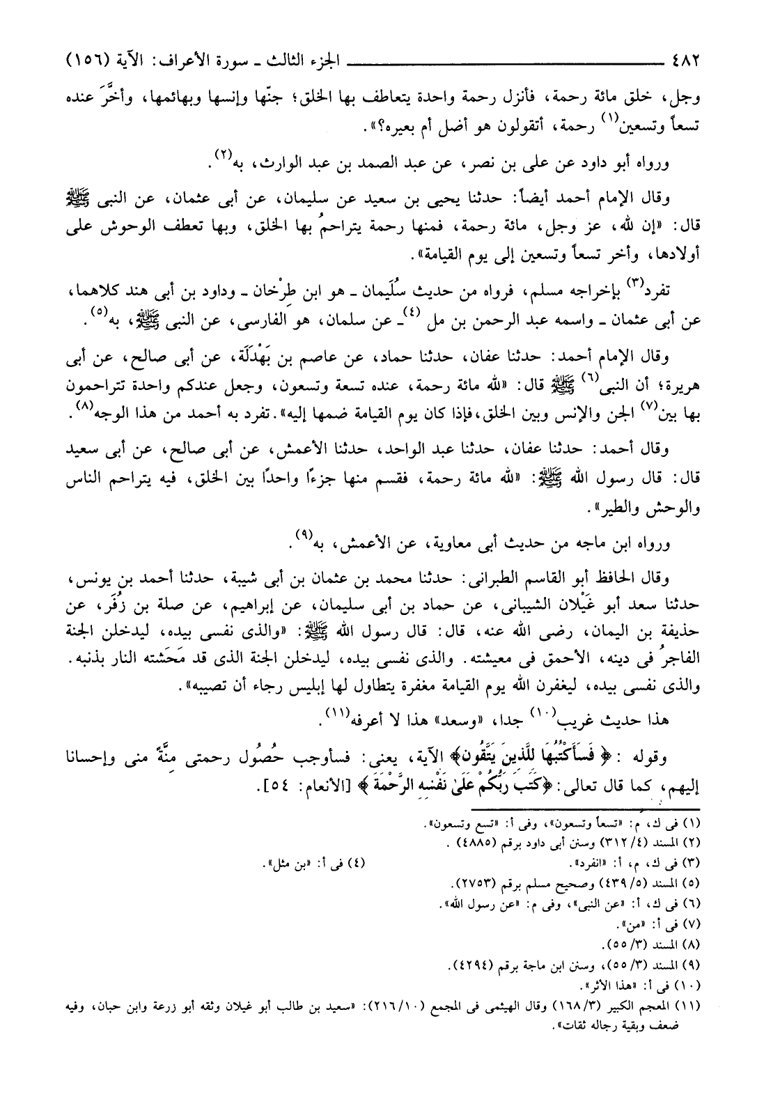 وَقَالَ الْإِمَامُ أَحْمَدُ أَيْضًا: حَدَّثَنَا يَحْيَى بْنُ سَعِيدٍ عَنْ سُلَيْمَانَ، عَنْ أَبِي عُثْمَانَ، عَنِ النَّبِيِّ صَلَّى اللَّهُ عَلَيْهِ وَسَلَّمَ قَالَ: "إِنْ لِلَّهِ عَزَّ وَجَلَّ، مِائَةَ رَحْمَةٍ، فَمِنْهَا رَحْمَةٌ يتراحمُ بِهَا الْخَلْقُ، وَبِهَا تَعْطِفُ الْوُحُوشُ عَلَى أَوْلَادِهَا، وَأَخَّرَ تِسْعًا وَتِسْعِينَ إِلَى يَوْمِ الْقِيَامَةِ".