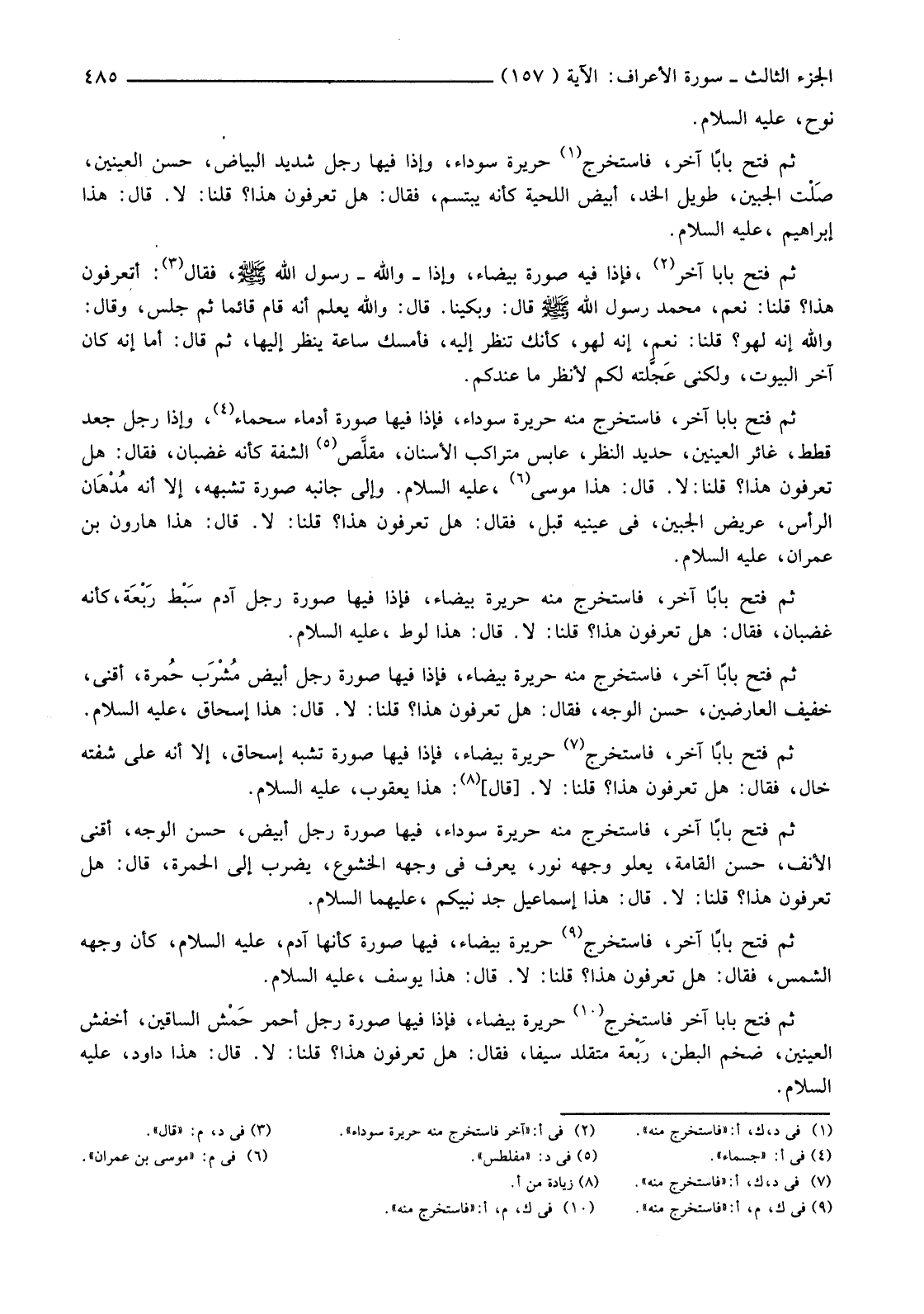 ثُمَّ فَتَحَ بَابًا آخَرَ، فَاسْتَخْرَجَ مِنْهُ حَرِيرَةً سَوْدَاءَ، فَإِذَا فِيهَا صُورَةٌ أَدْمَاءُ سَحْمَاءُ (4) وَإِذَا رَجُلٌ جَعْدٌ قَطَطٌ، غَائِرُ الْعَيْنَيْنِ، حَدِيدُ النَّظَرِ، عَابِسٌ مُتَرَاكِبُ الْأَسْنَانِ، مقلَّص (5) الشَّفَةِ كَأَنَّهُ غَضْبَانُ، فَقَالَ: هَلْ تَعْرِفُونَ هَذَا؟ قُلْنَا: لَا. قَالَ: هَذَا مُوسَى (6) عَلَيْهِ السَّلَامُ. وَإِلَى جَانِبَهُ صُورَةٌ تُشْبِهُهُ، إِلَّا أَنَّهُ مُدْهَان الرَّأْسِ، عَرِيضُ الْجَبِينِ، فِي عَيْنَيْهِ قَبَلٌ، فَقَالَ: هَلْ تَعْرِفُونَ هَذَا؟ قُلْنَا: لَا. قَالَ: هَذَا هَارُونُ بْنُ عِمْرَانَ، عَلَيْهِ السَّلَامُ.