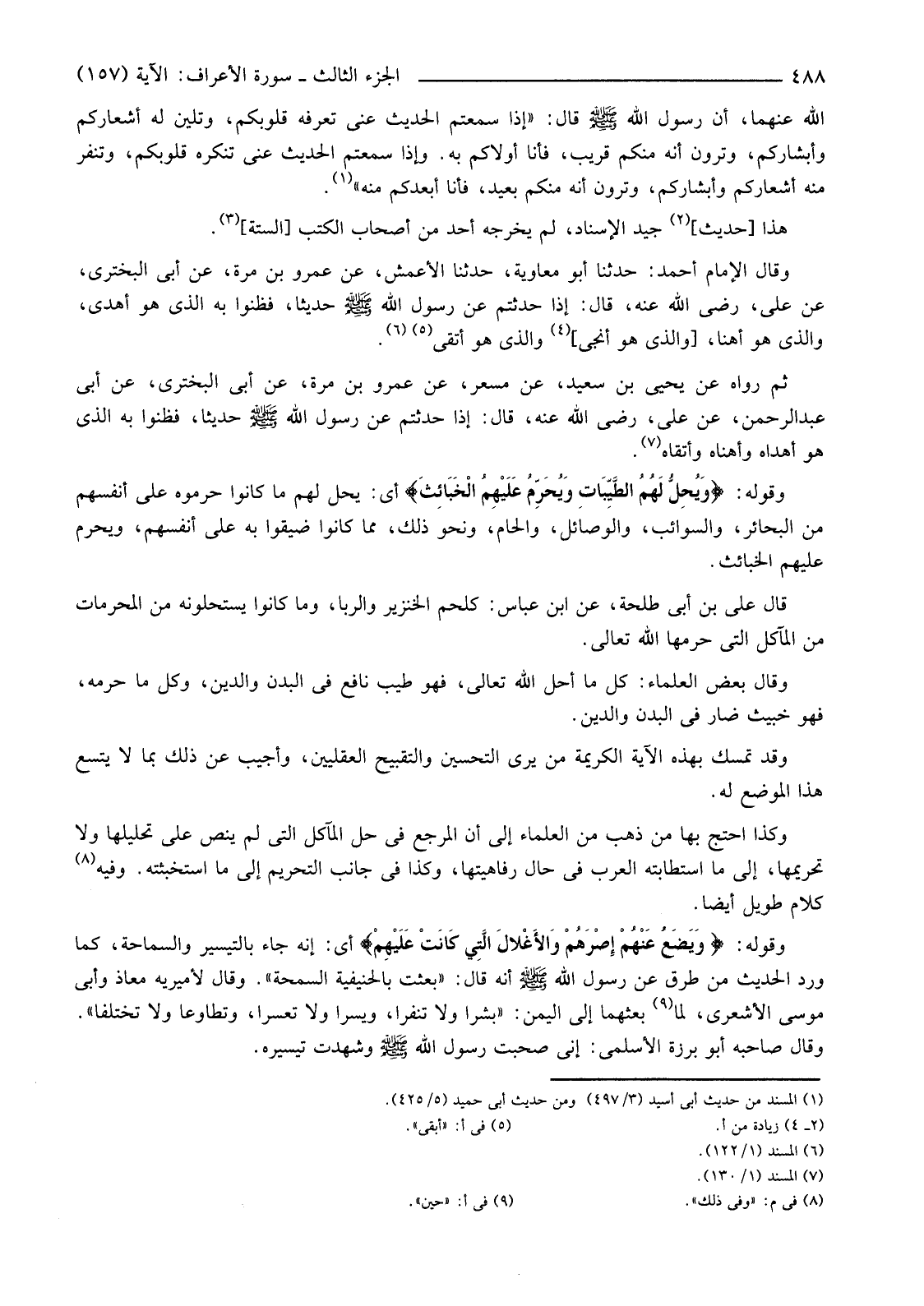 وَقَوْلُهُ: {وَيُحِلُّ لَهُمُ الطَّيِّبَاتِ وَيُحَرِّمُ عَلَيْهِمُ الْخَبَائِثَ} أَيْ: يُحِلُّ لَهُمْ مَا كَانُوا حَرَّمُوهُ عَلَى أَنْفُسِهِمْ مِنَ الْبَحَائِرِ، وَالسَّوَائِبِ، وَالْوَصَائِلِ، وَالِحَامِ، وَنَحْوِ ذَلِكَ، مِمَّا كَانُوا ضَيَّقُوا بِهِ عَلَى أَنْفُسِهِمْ، وَيُحَرِّمُ عَلَيْهِمُ الْخَبَائِثَ.