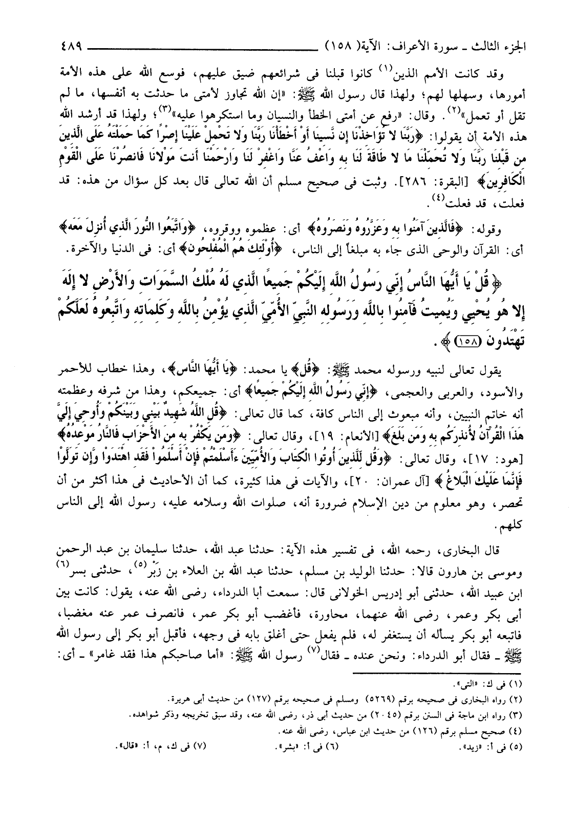 {قُلْ يَا أَيُّهَا النَّاسُ إِنِّي رَسُولُ اللَّهِ إِلَيْكُمْ جَمِيعًا الَّذِي لَهُ مُلْكُ السَّمَاوَاتِ وَالأرْضِ لَا إِلَهَ إِلا هُوَ يُحْيِي وَيُمِيتُ فَآمِنُوا بِاللَّهِ وَرَسُولِهِ النَّبِيِّ الأمِّيِّ الَّذِي يُؤْمِنُ بِاللَّهِ وَكَلِمَاتِهِ وَاتَّبِعُوهُ لَعَلَّكُمْ تَهْتَدُونَ (158) }