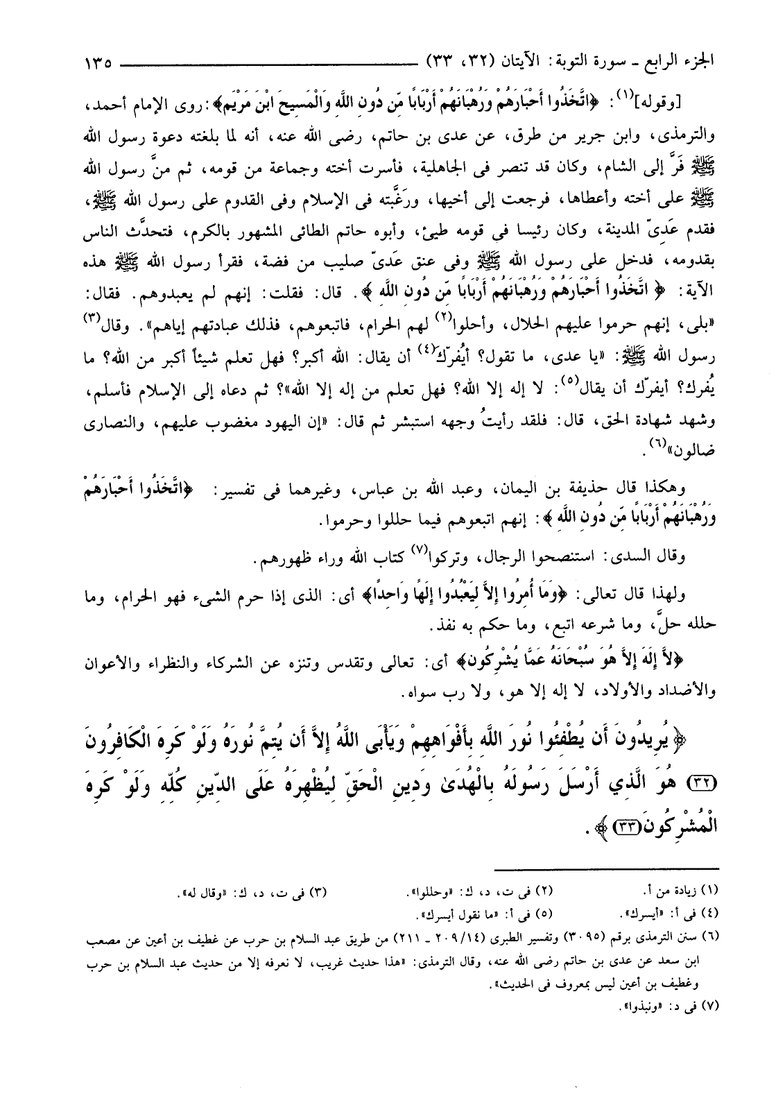 [وَقَوْلُهُ] (1) {اتَّخَذُوا أَحْبَارَهُمْ وَرُهْبَانَهُمْ أَرْبَابًا مِنْ دُونِ اللَّهِ وَالْمَسِيحَ ابْنَ مَرْيَمَ} رَوَى الْإِمَامُ أَحْمَدُ، وَالتِّرْمِذِيُّ، وَابْنُ جَرِيرٍ مِنْ طُرُقٍ، عَنْ عَدِيِّ بْنِ حَاتِمٍ، رَضِيَ اللَّهُ عَنْهُ، أَنَّهُ لَمَّا بَلَغَتْهُ دَعْوَةُ رَسُولِ اللَّهِ صَلَّى اللَّهُ عَلَيْهِ وَسَلَّمَ فرَّ إِلَى الشَّامِ، وَكَانَ قَدْ تَنَصَّرَ فِي الْجَاهِلِيَّةِ، فَأُسِرَتْ أُخْتُهُ وَجَمَاعَةٌ مِنْ قَوْمِهِ، ثمَّ منَّ رَسُولِ اللَّهِ صَلَّى اللَّهُ عَلَيْهِ وَسَلَّمَ عَلَى أُخْتِهِ وَأَعْطَاهَا، فَرَجَعَتْ إِلَى أَخِيهَا، ورَغَّبته فِي الْإِسْلَامِ وَفِي الْقُدُومِ عَلَى رَسُولِ اللَّهِ صَلَّى اللَّهُ عَلَيْهِ وَسَلَّمَ، فَقَدِمَ عَدِيّ الْمَدِينَةَ، وَكَانَ رَئِيسًا فِي قَوْمِهِ طَيِّئٍ، وَأَبُوهُ حَاتِمٌ الطَّائِيُّ الْمَشْهُورُ بِالْكَرَمِ، فتحدَّث النَّاسُ بِقُدُومِهِ، فَدَخَلَ عَلَى رَسُولِ اللَّهِ صَلَّى اللَّهُ عَلَيْهِ وَسَلَّمَ وَفِي عُنُقِ عَدِيّ صَلِيبٌ مِنْ فِضَّةٍ، فَقَرَأَ رَسُولُ اللَّهِ صَلَّى اللَّهُ عَلَيْهِ وَسَلَّمَ هَذِهِ الْآيَةَ: {اتَّخَذُوا أَحْبَارَهُمْ وَرُهْبَانَهُمْ أَرْبَابًا مِنْ دُونِ اللَّهِ} قَالَ: فَقُلْتُ: إِنَّهُمْ لَمْ يَعْبُدُوهُمْ. فَقَالَ: "بَلَى، إِنَّهُمْ حَرَّمُوا عَلَيْهِمُ الْحَلَالَ، وَأَحَلُّوا (2) لَهُمُ الْحَرَامَ، فَاتَّبَعُوهُمْ، فَذَلِكَ عِبَادَتُهُمْ إِيَّاهُمْ". وَقَالَ (3) رَسُولُ اللَّهِ صَلَّى اللَّهُ عَلَيْهِ وَسَلَّمَ: "يَا عَدِيُّ، مَا تَقُولُ؟ أيُفرّك (4) أَنْ يُقَالَ: اللَّهُ أَكْبَرُ؟ فَهَلْ تَعْلَمُ شَيْئًا أَكْبَرَ مِنَ اللَّهِ؟ مَا يُفرك؟ أَيُفِرُّكَ أَنْ يُقَالَ (5) لَا إِلَهَ إِلَّا اللَّهُ؟ فَهَلْ تَعْلَمُ مِنْ إِلَهٍ إِلَّا اللَّهُ"؟ ثُمَّ دَعَاهُ إِلَى الْإِسْلَامِ فَأَسْلَمَ، وَشَهِدَ شَهَادَةَ الْحَقِّ، قَالَ: فَلَقَدْ رأيتُ وَجْهَهُ اسْتَبْشَرَ ثُمَّ قَالَ: "إِنَّ الْيَهُودَ مَغْضُوبٌ عَلَيْهِمْ، وَالنَّصَارَى ضَالُّونَ" (6)