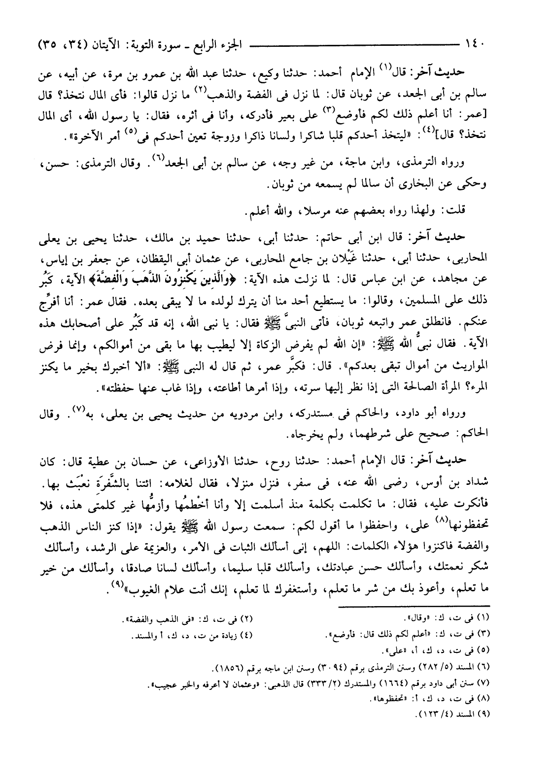 حَدِيثٌ آخَرُ: قَالَ ابْنُ أَبِي حَاتِمٍ: حَدَّثَنَا أَبِي، حَدَّثَنَا حُمَيْدُ بْنُ مَالِكٍ، حَدَّثَنَا يَحْيَى بْنُ يَعْلَى الْمُحَارِبِيُّ، حَدَّثَنَا أَبِي، حَدَّثَنَا غَيْلان بْنُ جَامِعٍ الْمُحَارِبِيُّ، عَنْ عُثْمَانَ أَبِي الْيَقْظَانِ، عَنْ جَعْفَرِ بْنِ إِيَاسٍ، عَنْ مُجَاهِدٍ، عَنِ ابْنِ عَبَّاسٍ قَالَ: لَمَّا نَزَلَتْ هَذِهِ الْآيَةُ: {وَالَّذِينَ يَكْنزونَ الذَّهَبَ وَالْفِضَّةَ} الْآيَةَ، كَبُر ذَلِكَ عَلَى الْمُسْلِمِينَ، وَقَالُوا: مَا يَسْتَطِيعُ أَحَدٌ مِنَّا أَنْ يَتْرُكَ لِوَلَدِهِ مَا لَا يَبْقَى بَعْدَهُ. فَقَالَ عُمَرُ: أَنَا أفرِّج عَنْكُمْ. فَانْطَلَقَ عُمَرُ وَاتَّبَعَهُ ثَوْبَانُ، فَأَتَى النَّبِيَّ صَلَّى اللَّهُ عَلَيْهِ وَسَلَّمَ فَقَالَ: يَا نبيَّ اللَّهِ، إِنَّهُ قَدْ كَبُر عَلَى أَصْحَابِكَ هَذِهِ الْآيَةَ. فَقَالَ نبيُّ اللَّهِ صَلَّى اللَّهُ عَلَيْهِ وَسَلَّمَ: "إِنَّ اللَّهَ لَمْ يَفْرِضِ الزَّكَاةَ إِلَّا لِيُطَيِّبَ بِهَا مَا بَقِيَ مِنْ أَمْوَالِكُمْ، وَإِنَّمَا فَرَضَ الْمَوَارِيثَ مِنْ أَمْوَالٍ تَبْقَى بَعْدَكُمْ". قَالَ: فكبَّر عُمَرُ، ثُمَّ قَالَ لَهُ النَّبِيُّ صَلَّى اللَّهُ عَلَيْهِ وَسَلَّمَ: "أَلَا أُخْبِرُكَ بِخَيْرِ مَا يَكْنِزُ الْمَرْءُ؟ الْمَرْأَةُ الصَّالِحَةُ الَّتِي إِذَا نَظَرَ إِلَيْهَا سَرَّتْهُ، وَإِذَا أَمَرَهَا أَطَاعَتْهُ، وَإِذَا غَابَ عَنْهَا حَفِظَتْهُ".