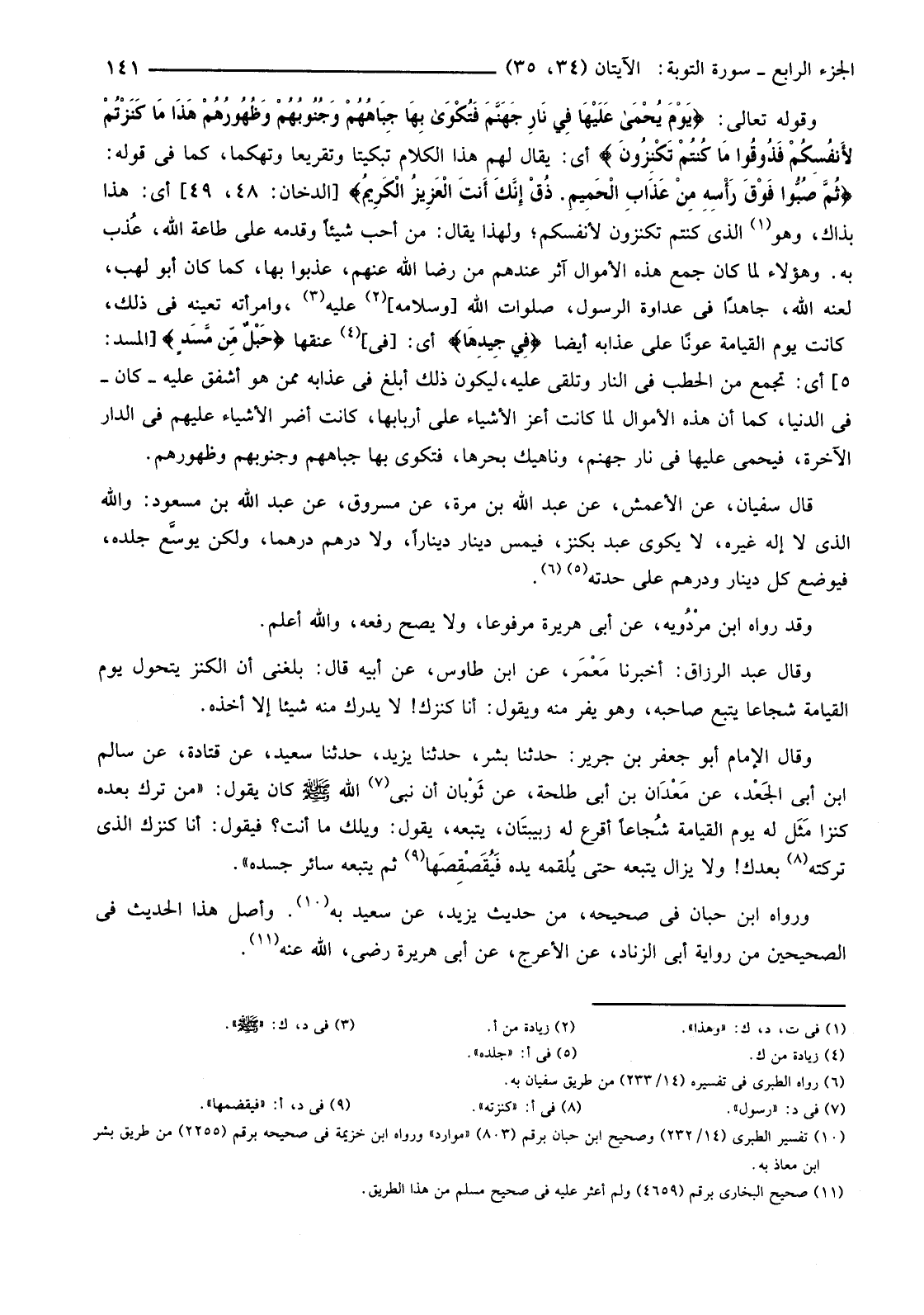 وَقَوْلُهُ تَعَالَى: {يَوْمَ يُحْمَى عَلَيْهَا فِي نَارِ جَهَنَّمَ فَتُكْوَى بِهَا جِبَاهُهُمْ وَجُنُوبُهُمْ وَظُهُورُهُمْ هَذَا مَا كَنزتُمْ لأنْفُسِكُمْ فَذُوقُوا مَا كُنْتُمْ تَكْنزونَ} أَيْ: يُقَالُ لَهُمْ هَذَا الْكَلَامُ تَبْكِيتًا وَتَقْرِيعًا وَتَهَكُّمًا، كَمَا فِي قَوْلِهِ: {ثُمَّ صُبُّوا فَوْقَ رَأْسِهِ مِنْ عَذَابِ الْحَمِيمِ ذُقْ إِنَّكَ أَنْتَ الْعَزِيزُ الْكَرِيمُ} [الدُّخَانِ: 48، 49] أَيْ: هَذَا بِذَاكَ، وَهُوَ (1) الَّذِي كُنْتُمْ تَكْنِزُونَ لِأَنْفُسِكُمْ؛ وَلِهَذَا يُقَالُ: مَنْ أَحَبَّ شَيْئًا وَقَدَّمَهُ عَلَى طَاعَةِ اللَّهِ، عُذِّبَ بِهِ. وَهَؤُلَاءِ لَمَّا كَانَ جَمْعُ هَذِهِ الْأَمْوَالِ آثَرَ عِنْدَهُمْ مِنْ رِضَا اللَّهِ عَنْهُمْ، عُذِّبُوا بِهَا، كَمَا كَانَ أَبُو لَهَبٍ، لَعَنَهُ اللَّهُ، جَاهِدًا فِي عَدَاوَةِ الرَّسُولِ، صَلَوَاتُ اللَّهِ [وَسَلَامُهُ] (2) عَلَيْهِ (3) وَامْرَأَتُهُ تُعِينُهُ فِي ذَلِكَ، كَانَتْ يَوْمَ الْقِيَامَةِ عَوْنًا عَلَى عَذَابِهِ أَيْضًا {فِي جِيدِهَا} أَيْ: [فِي] (4) عُنُقِهَا {حَبْلٌ مِنْ مَسَدٍ} [الْمَسَدِ: 5] أَيْ: تَجْمَعُ مِنَ الْحَطَبِ فِي النَّارِ وَتُلْقِي عَلَيْهِ، لِيَكُونَ ذَلِكَ أَبْلَغَ فِي عَذَابِهِ مِمَّنْ هُوَ أَشْفَقُ عَلَيْهِ -كَانَ -فِي الدُّنْيَا، كَمَا أَنَّ هَذِهِ الْأَمْوَالَ لَمَّا كَانَتْ أَعَزَّ الْأَشْيَاءِ عَلَى أَرْبَابِهَا، كَانَتْ أَضَرَّ الْأَشْيَاءِ عَلَيْهِمْ فِي الدَّارِ الْآخِرَةِ، فَيُحْمَى عَلَيْهَا فِي نَارِ جَهَنَّمَ، وَنَاهِيكَ بِحَرِّهَا، فَتُكْوَى بِهَا جِبَاهُهُمْ وَجُنُوبُهُمْ وَظُهُورُهُمْ.