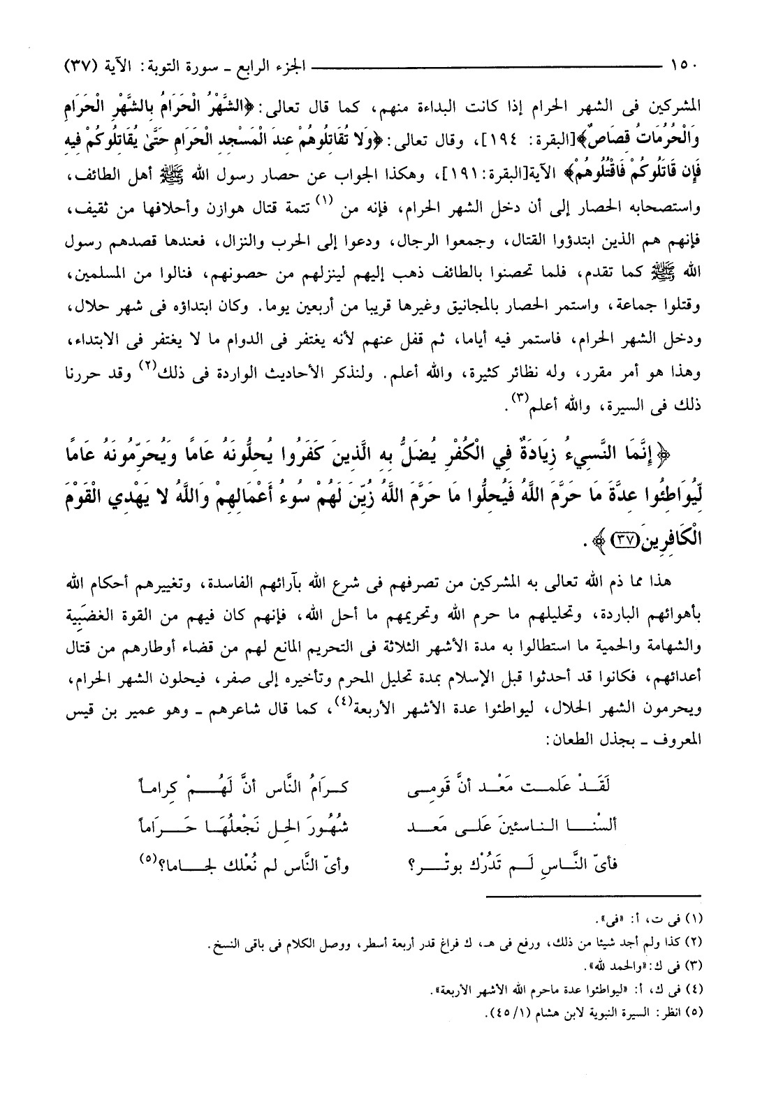 هَذَا مِمَّا ذَمَّ اللَّهُ تَعَالَى بِهِ الْمُشْرِكِينَ مِنْ تَصَرُّفِهِمْ فِي شَرْعِ اللَّهِ بِآرَائِهِمُ الْفَاسِدَةِ، وَتَغْيِيرِهِمْ أَحْكَامَ اللَّهِ بِأَهْوَائِهِمُ الْبَارِدَةِ، وَتَحْلِيلِهِمْ مَا حَرَّمَ اللَّهُ وَتَحْرِيمِهِمْ مَا أَحَلَّ اللَّهُ، فَإِنَّهُمْ كَانَ فِيهِمْ مِنَ الْقُوَّةِ الغضَبِية وَالشَّهَامَةِ وَالْحَمِيَّةِ مَا اسْتَطَالُوا بِهِ مُدَّةَ الْأَشْهُرِ الثَّلَاثَةِ فِي التَّحْرِيمِ الْمَانِعِ لَهُمْ مِنْ قَضَاءِ أَوْطَارِهِمْ مِنْ قِتَالِ أَعْدَائِهِمْ، فَكَانُوا قَدْ أَحْدَثُوا قَبْلَ الْإِسْلَامِ بِمُدَّةٍ تَحْلِيلَ الْمُحَرَّمِ وَتَأْخِيرَهُ إِلَى صَفَرٍ، فَيُحِلُّونَ الشَّهْرَ الْحَرَامَ، وَيُحَرِّمُونَ الشَّهْرَ الْحَلَالَ، لِيُوَاطِئُوا عِدَّةَ الْأَشْهُرِ الْأَرْبَعَةِ (1) كَمَا قَالَ شَاعِرُهُمْ -وَهُوَ عُمَيْرُ بْنُ قَيْسٍ الْمَعْرُوفُ -بِجِذْلِ الطِّعَانِ: