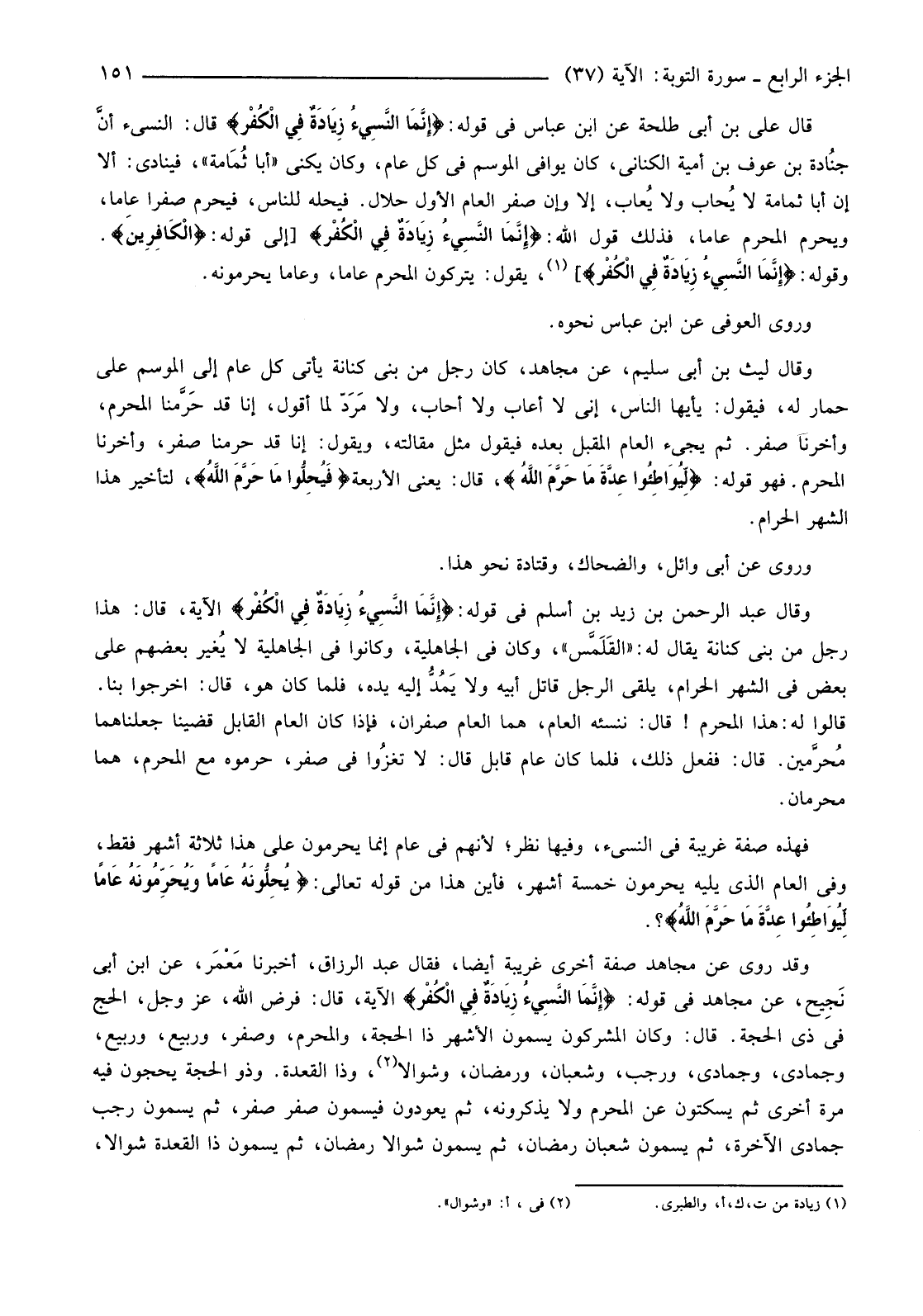 قَالَ عَلِيُّ بْنُ أَبِي طَلْحَةَ عَنِ ابْنِ عَبَّاسٍ فِي قَوْلِهِ: {إِنَّمَا النَّسِيءُ زِيَادَةٌ فِي الْكُفْرِ} قَالَ: النَّسِيءُ أنَّ جُنادة بْنَ عَوْفِ بْنِ أُمَيَّةَ الْكِنَانِيَّ، كَانَ يُوَافِي الْمَوْسِمَ فِي كُلِّ عَامٍ، وَكَانَ يُكَنَّى "أَبَا ثُمَامة"، فَيُنَادِي: أَلَا إِنَّ أَبَا ثُمَامَةَ لَا يُحاب وَلَا يُعاب، أَلَا وَإِنَّ صَفَرَ الْعَامَ الْأَوَّلَ حَلَالٌ. فَيَحِلُّهُ لِلنَّاسِ، فَيُحَرِّمُ صَفَرًا عَامًا، وَيُحَرِّمُ الْمُحَرَّمَ عَامًا، فَذَلِكَ قَوْلُ اللَّهِ: {إِنَّمَا النَّسِيءُ زِيَادَةٌ فِي الْكُفْرِ} [إِلَى قَوْلِهِ: {الْكَافِرِينَ} وَقَوْلُهُ {إِنَّمَا النَّسِيءُ زِيَادَةٌ فِي الْكُفْرِ} ] (1) يَقُولُ: يَتْرُكُونَ الْمُحَرَّمَ عَامًا، وَعَامًا يُحَرِّمُونَهُ.