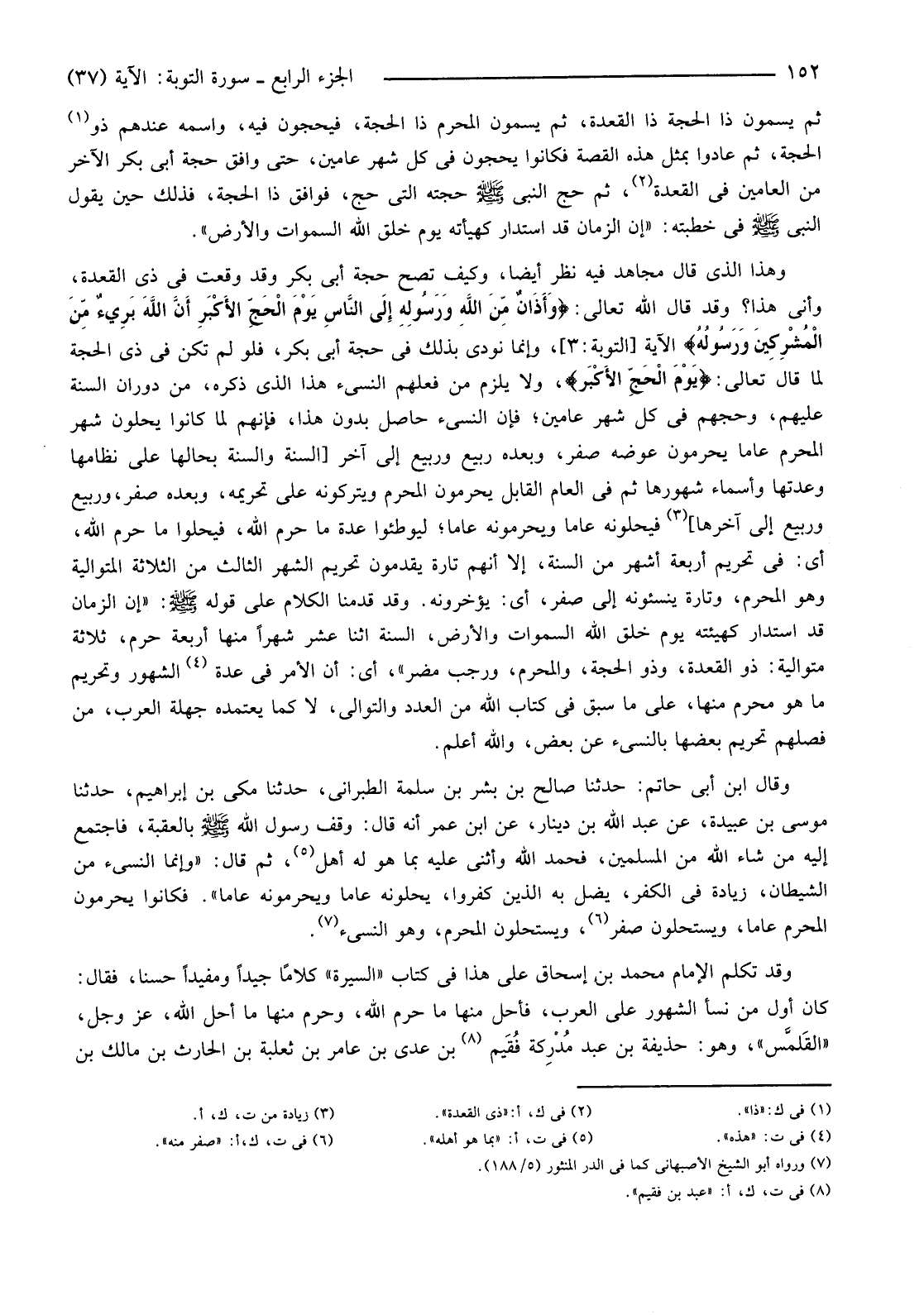 وَقَدْ تَكَلَّمَ الْإِمَامُ مُحَمَّدُ بْنُ إِسْحَاقَ عَلَى هَذَا فِي كِتَابِ "السِّيرَةِ" كَلَامًا جَيِّدًا وَمُفِيدًا حَسَنًا، فَقَالَ: كَانَ أَوَّلَ مَنْ نَسَأَ الشُّهُورَ عَلَى الْعَرَبِ، فَأَحَلَّ مِنْهَا مَا حَرَّمَ اللَّهُ، وَحَرَّمَ مِنْهَا مَا أَحَلَّ اللَّهُ، عَزَّ وَجَلَّ، "القَلمَّس"، وَهُوَ: حُذَيْفَةُ بْنُ عَبْدِ مُدْرِكة فُقَيم (8) بْنُ عَدِيِّ بْنِ عَامِرِ بْنِ ثَعْلَبَةَ بْنِ الْحَارِثِ بْنِ مَالِكِ بن