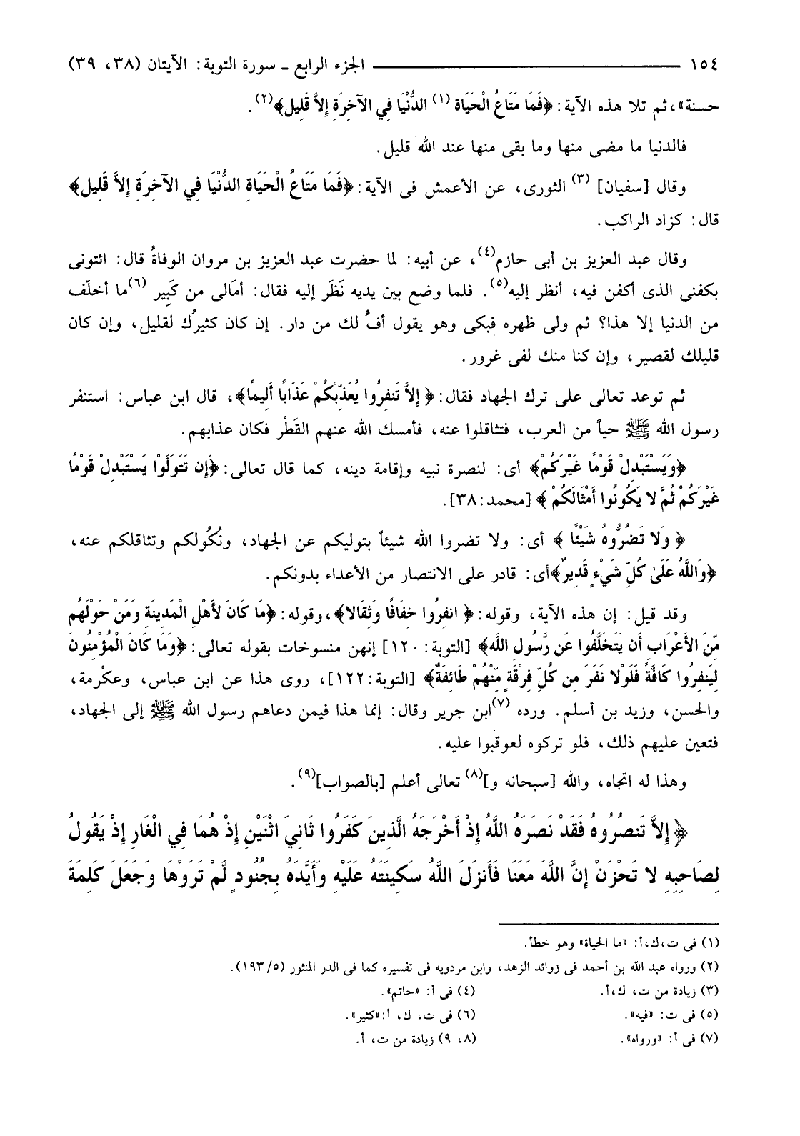 وَقَدْ قِيلَ: إِنَّ هَذِهِ الْآيَةَ، وَقَوْلَهُ: {انْفِرُوا خِفَافًا وَثِقَالا} وَقَوْلَهُ {مَا كَانَ لأهْلِ الْمَدِينَةِ وَمَنْ حَوْلَهُمْ مِنَ الأعْرَابِ أَنْ يَتَخَلَّفُوا عَنْ رَسُولِ اللَّهِ} [التَّوْبَةِ: 120] إِنَّهُنَّ مَنْسُوخَاتٌ بِقَوْلِهِ تَعَالَى: {وَمَا كَانَ الْمُؤْمِنُونَ لِيَنْفِرُوا كَافَّةً فَلَوْلا نَفَرَ مِنْ كُلِّ فِرْقَةٍ مِنْهُمْ طَائِفَةٌ} [التَّوْبَةِ: 122] رُوي هَذَا عَنِ ابْنِ عَبَّاسٍ، وعِكْرِمة، وَالْحَسَنِ، وَزَيْدِ بْنِ أَسْلَمَ. وَرَدَّهُ (7) ابْنُ جَرِيرٍ وَقَالَ: إِنَّمَا هَذَا فِيمَنْ دَعَاهُمْ رَسُولُ اللَّهِ صَلَّى اللَّهُ عَلَيْهِ وَسَلَّمَ إِلَى الْجِهَادِ، فَتَعَيَّنَ عَلَيْهِمْ ذَلِكَ، فَلَوْ تَرَكُوهُ لَعُوقِبُوا عَلَيْهِ.