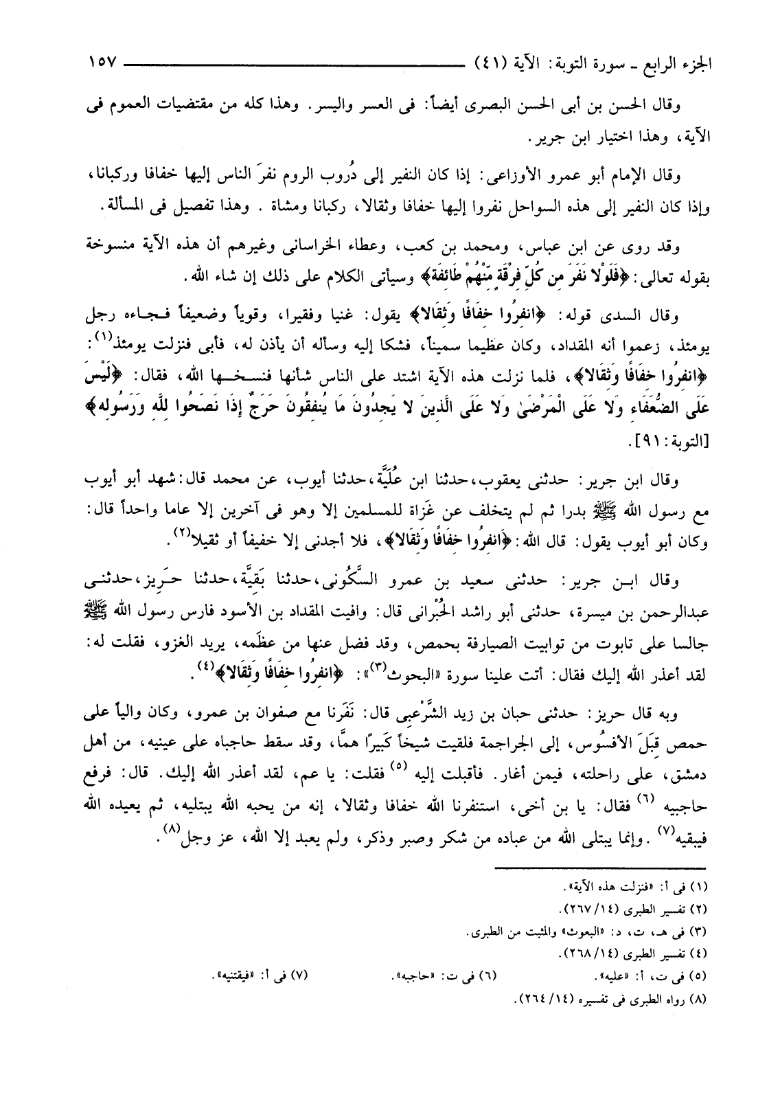 وَقَالَ ابْنُ جَرِيرٍ: حَدَّثَنِي يَعْقُوبُ، حَدَّثَنَا ابْنُ عُلَيَّة، حَدَّثَنَا أَيُّوبُ، عَنْ مُحَمَّدٍ قَالَ: شَهِدَ أَبُو أَيُّوبَ مَعَ رَسُولِ اللَّهِ صَلَّى اللَّهُ عَلَيْهِ وَسَلَّمَ بَدْرًا ثُمَّ لَمْ يَتَخَلَّفْ عَنْ غَزاة لِلْمُسْلِمِينَ إِلَّا وَهُوَ فِي آخَرِينَ إِلَّا عَامًا وَاحِدًا قَالَ: وَكَانَ أَبُو أَيُّوبَ يَقُولُ: قَالَ اللَّهُ: {انْفِرُوا خِفَافًا وَثِقَالا} فَلَا أَجِدُنِي إِلَّا خَفِيفًا أَوْ ثَقِيلًا (2)