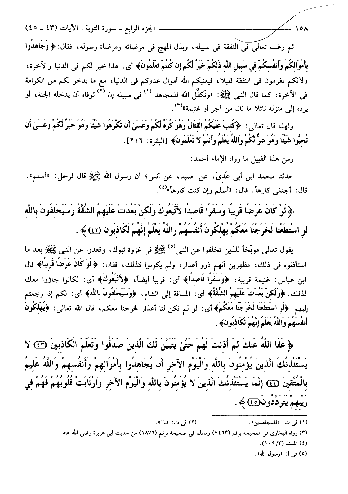 {عَفَا اللَّهُ عَنْكَ لِمَ أَذِنْتَ لَهُمْ حَتَّى يَتَبَيَّنَ لَكَ الَّذِينَ صَدَقُوا وَتَعْلَمَ الْكَاذِبِينَ (43) لَا يَسْتَأْذِنُكَ الَّذِينَ يُؤْمِنُونَ بِاللَّهِ وَالْيَوْمِ الآخِرِ أَنْ يُجَاهِدُوا بِأَمْوَالِهِمْ وَأَنْفُسِهِمْ وَاللَّهُ عَلِيمٌ بِالْمُتَّقِينَ (44) إِنَّمَا يَسْتَأْذِنُكَ الَّذِينَ لَا يُؤْمِنُونَ بِاللَّهِ وَالْيَوْمِ الآخِرِ وَارْتَابَتْ قُلُوبُهُمْ فَهُمْ فِي رَيْبِهِمْ يَتَرَدَّدُونَ (45) }