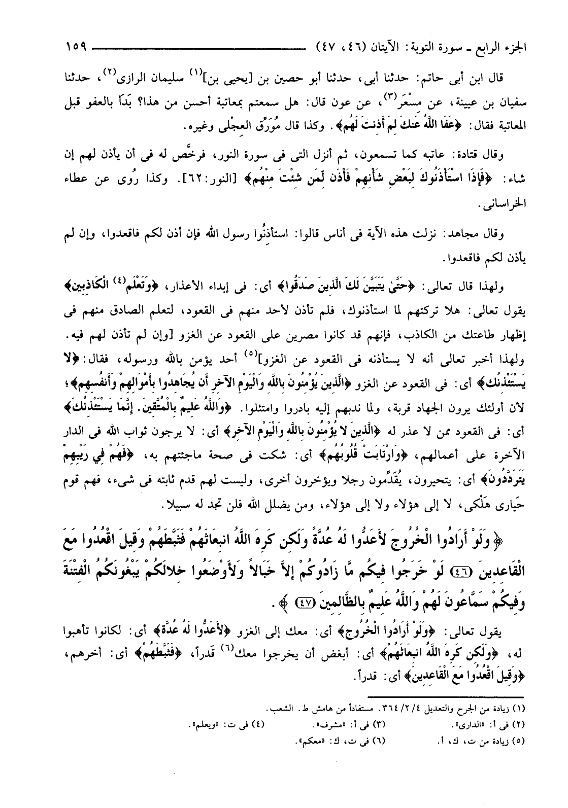قَالَ ابْنُ أَبِي حَاتِمٍ: حَدَّثَنَا أَبِي، حَدَّثَنَا أَبُو حُصَيْنِ بْنُ [يَحْيَى بْنِ] (1) سُلَيْمَانَ الرَّازِيُّ (2) حَدَّثَنَا سُفْيَانُ بْنُ عُيَيْنَةَ، عَنْ مِسْعَر (3) عَنْ عَوْنٍ قَالَ: هَلْ سَمِعْتُمْ بِمُعَاتِبَةٍ أَحْسَنَ مِنْ هَذَا؟ بَدَأَ بِالْعَفْوِ قَبْلَ الْمُعَاتَبَةِ فَقَالَ: {عَفَا اللَّهُ عَنْكَ لِمَ أَذِنْتَ لَهُمْ} وَكَذَا قَالَ مُوَرِّق العِجْلي وَغَيْرُهُ.