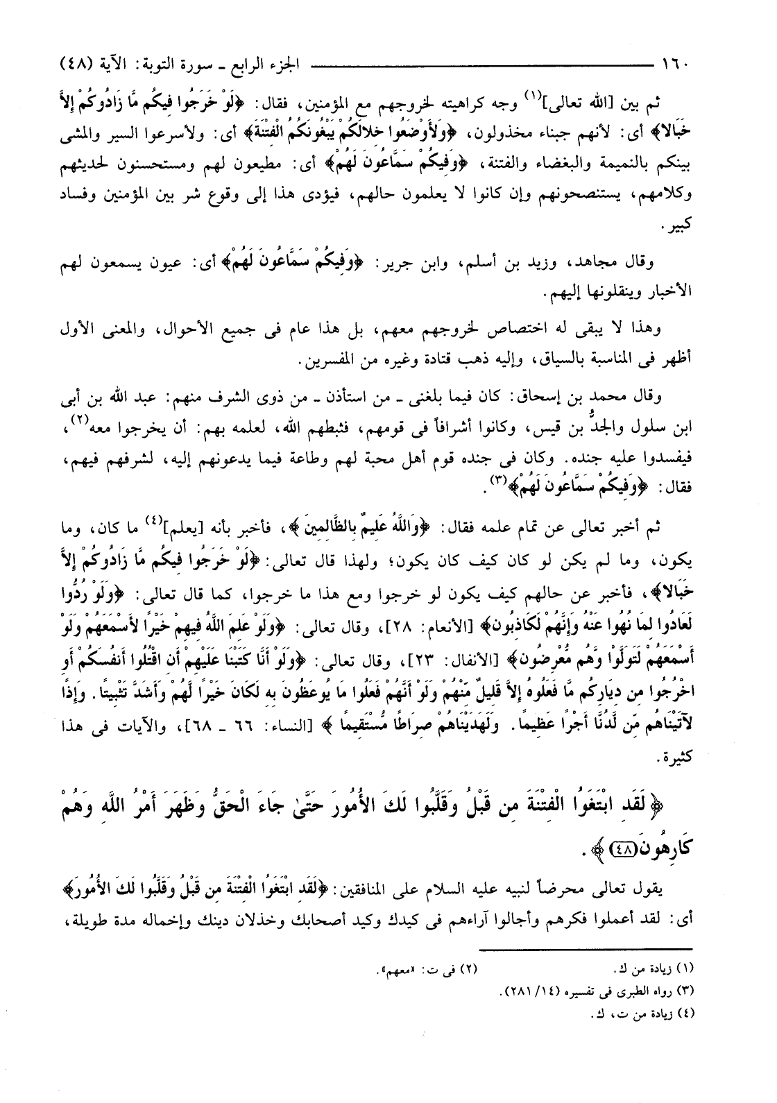 ثُمَّ بَيَّنَ [اللَّهُ تَعَالَى] (1) وَجْهَ كَرَاهِيَتِهِ لِخُرُوجِهِمْ مَعَ الْمُؤْمِنِينَ. فَقَالَ: {لَوْ خَرَجُوا فِيكُمْ مَا زَادُوكُمْ إِلا خَبَالا} أَيْ: لِأَنَّهُمْ جُبَنَاءُ مَخْذُولُونَ، {وَلأوْضَعُوا خِلالَكُمْ يَبْغُونَكُمُ الْفِتْنَةَ} أَيْ: وَلَأَسْرَعُوا السَّيْرَ وَالْمَشْيَ بَيْنَكُمْ بِالنَّمِيمَةِ وَالْبَغْضَاءِ وَالْفِتْنَةِ، {وَفِيكُمْ سَمَّاعُونَ لَهُمْ} أَيْ: مُطِيعُونَ لَهُمْ وَمُسْتَحْسِنُونَ لِحَدِيثِهِمْ وَكَلَامِهِمْ، يَسْتَنْصِحُونَهُمْ وَإِنْ كَانُوا لَا يَعْلَمُونَ حَالَهُمْ، فَيُؤَدِّي هَذَا إِلَى وُقُوعِ شَرٍّ بَيْنَ الْمُؤْمِنِينَ وَفَسَادٍ كَبِيرٍ.