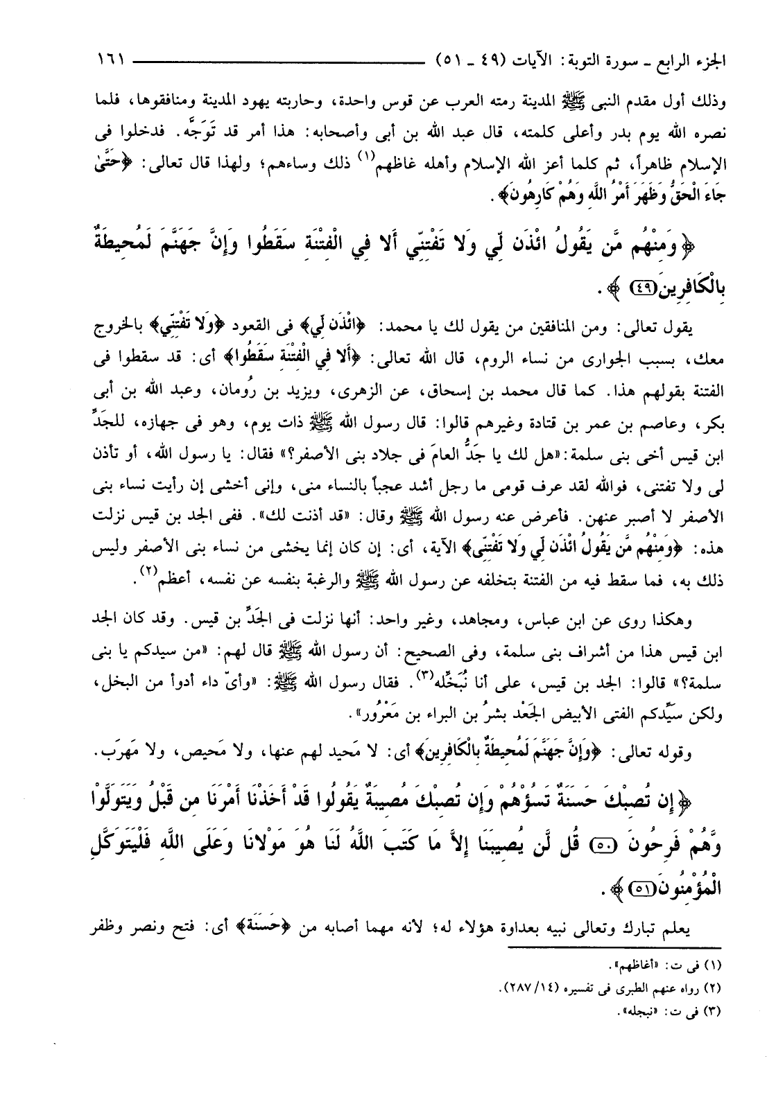 يَقُولُ تَعَالَى: وَمِنَ الْمُنَافِقِينَ مَنْ يَقُولُ لَكَ يَا مُحَمَّدُ: {ائْذَنْ لِي} فِي الْقُعُودِ {وَلا تَفْتِنِّي} بِالْخُرُوجِ مَعَكَ، بِسَبَبِ الْجَوَارِي مِنْ نِسَاءِ الرُّومِ، قَالَ اللَّهُ تَعَالَى: {أَلا فِي الْفِتْنَةِ سَقَطُوا} أَيْ: قَدْ سَقَطُوا فِي الْفِتْنَةِ بِقَوْلِهِمْ هَذَا. كَمَا قَالَ مُحَمَّدُ بْنُ إِسْحَاقَ، عَنِ الزُّهْرِيِّ، وَيَزِيدَ بْنِ رُومان، وَعَبْدِ اللَّهِ بْنِ أَبِي بَكْرٍ، وَعَاصِمِ بْنِ عُمَرَ بْنِ قَتَادَةَ وَغَيْرِهِمْ قَالُوا: قَالَ رَسُولُ اللَّهِ صَلَّى اللَّهُ عَلَيْهِ وَسَلَّمَ ذَاتَ يَوْمٍ، وَهُوَ فِي جَهَازِهِ، لِلْجَدِّ بْنِ قَيْسٍ أَخِي بَنِي سَلَمَةَ: "هَلْ لَكَ يَا جَدُّ العامَ فِي جِلَادِ بَنِي الْأَصْفَرِ؟ " فَقَالَ: يَا رسول الله، أو تأذن لِي وَلَا تَفْتِنِّي، فَوَاللَّهِ لَقَدْ عَرَفَ قَوْمِي مَا رَجُلٌ أَشَدُّ عَجَبًا بِالنِّسَاءِ مِنِّي، وَإِنِّي أَخْشَى إِنْ رَأَيْتُ نِسَاءَ بَنِي الْأَصْفَرِ لَا أَصْبِرُ عَنْهُنَّ. فَأَعْرَضَ عَنْهُ رَسُولُ اللَّهِ صَلَّى اللَّهُ عَلَيْهِ وَسَلَّمَ وَقَالَ: "قَدْ أَذِنْتُ لَكَ". فَفِي الجَدِّ بْنِ قَيْسٍ نَزَلَتْ هَذِهِ: {وَمِنْهُمْ مَنْ يَقُولُ ائْذَنْ لِي وَلا تَفْتِنِّي} الْآيَةَ، أَيْ: إِنْ كَانَ إِنَّمَا يَخْشَى مِنْ نِسَاءِ بَنِي الْأَصْفَرِ وَلَيْسَ ذَلِكَ بِهِ، فَمَا سَقَطَ فِيهِ مِنَ الْفِتْنَةِ بِتَخَلُّفِهِ عَنْ رَسُولِ اللَّهِ صَلَّى اللَّهُ عَلَيْهِ وَسَلَّمَ وَالرَّغْبَةِ بِنَفْسِهِ عَنْ نَفْسِهِ، أَعْظَمُ (2)