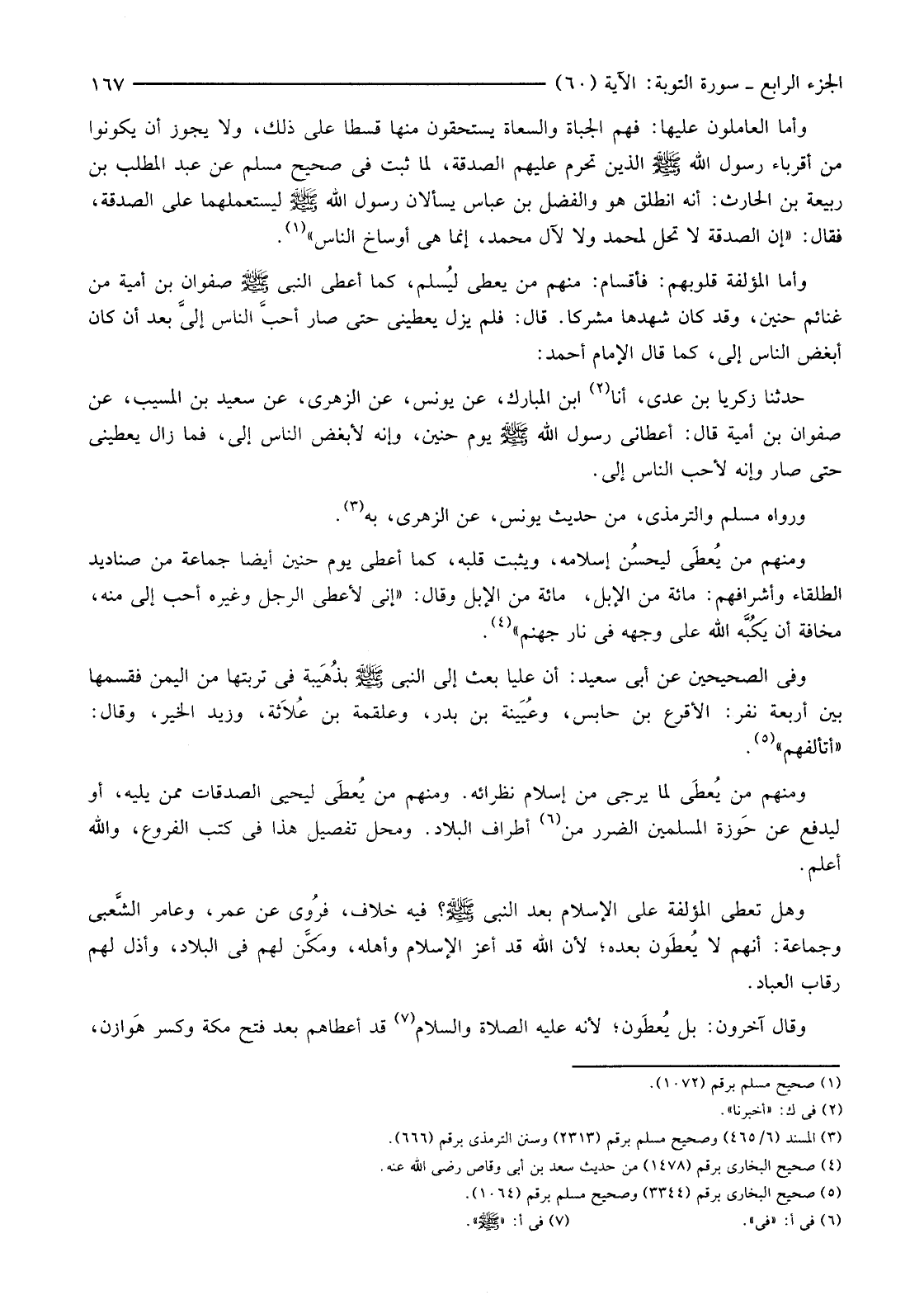 وَأَمَّا الْمُؤَلَّفَةُ قُلُوبُهُمْ: فَأَقْسَامٌ: مِنْهُمْ مَنْ يُعْطَى ليُسلم، كَمَا أَعْطَى النَّبِيُّ صَلَّى اللَّهُ عَلَيْهِ وَسَلَّمَ صَفْوَانَ بْنَ أُمَيَّةَ مِنْ غَنَائِمِ حُنَيْنٍ، وَقَدْ كَانَ شَهِدَهَا مُشْرِكًا. قَالَ: فَلَمْ يَزَلْ يُعْطِينِي حَتَّى صَارَ أحبَّ النَّاسِ إليَّ بَعْدَ أَنْ كَانَ أَبْغَضَ النَّاسِ إِلَيَّ، كَمَا قَالَ الْإِمَامُ أَحْمَدُ: