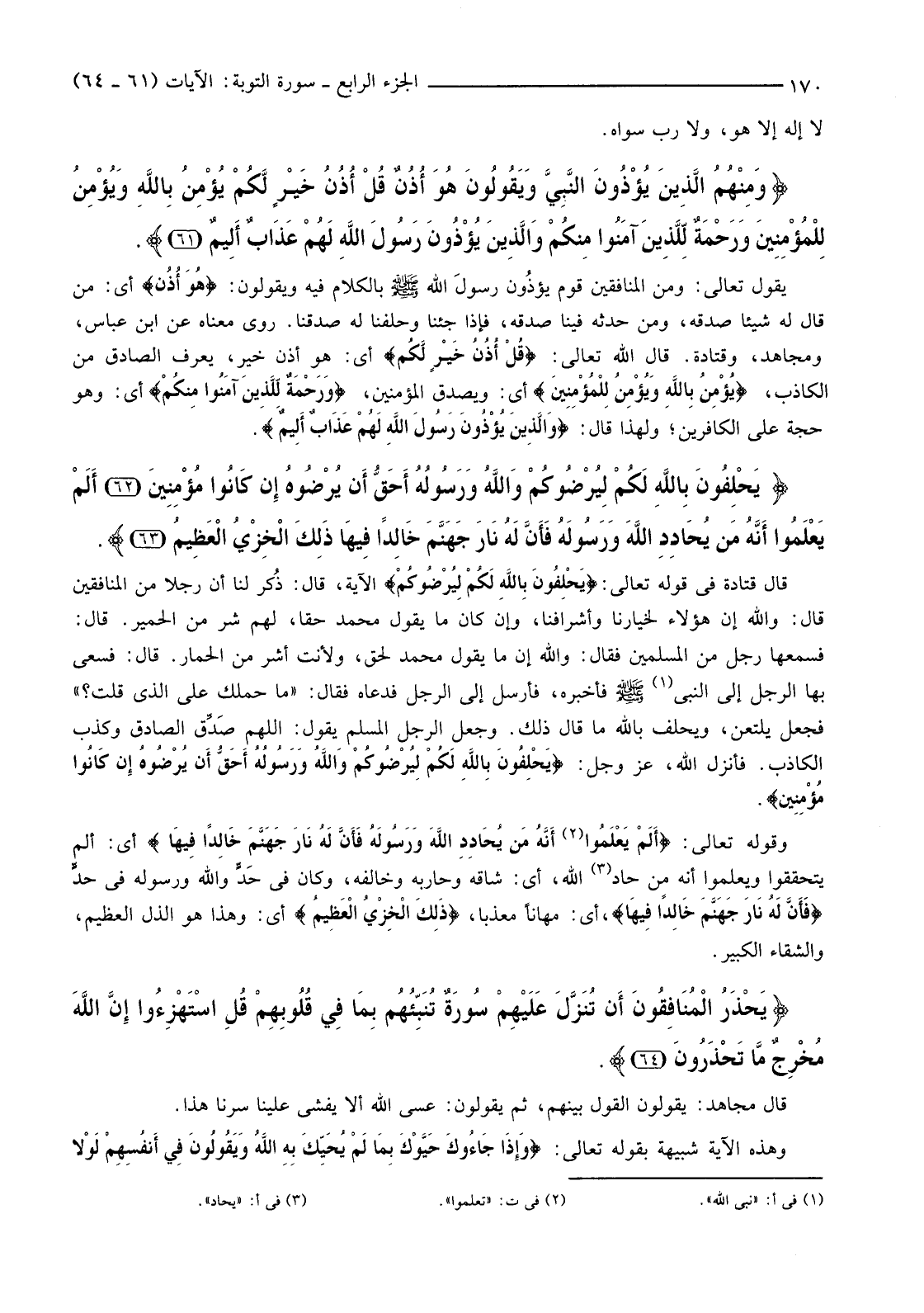 {يَحْلِفُونَ بِاللَّهِ لَكُمْ لِيُرْضُوكُمْ وَاللَّهُ وَرَسُولُهُ أَحَقُّ أَنْ يُرْضُوهُ إِنْ كَانُوا مُؤْمِنِينَ (62) أَلَمْ يَعْلَمُوا أَنَّهُ مَنْ يُحَادِدِ اللَّهَ وَرَسُولَهُ فَأَنَّ لَهُ نَارَ جَهَنَّمَ خَالِدًا فِيهَا ذَلِكَ الْخِزْيُ الْعَظِيمُ (63) }