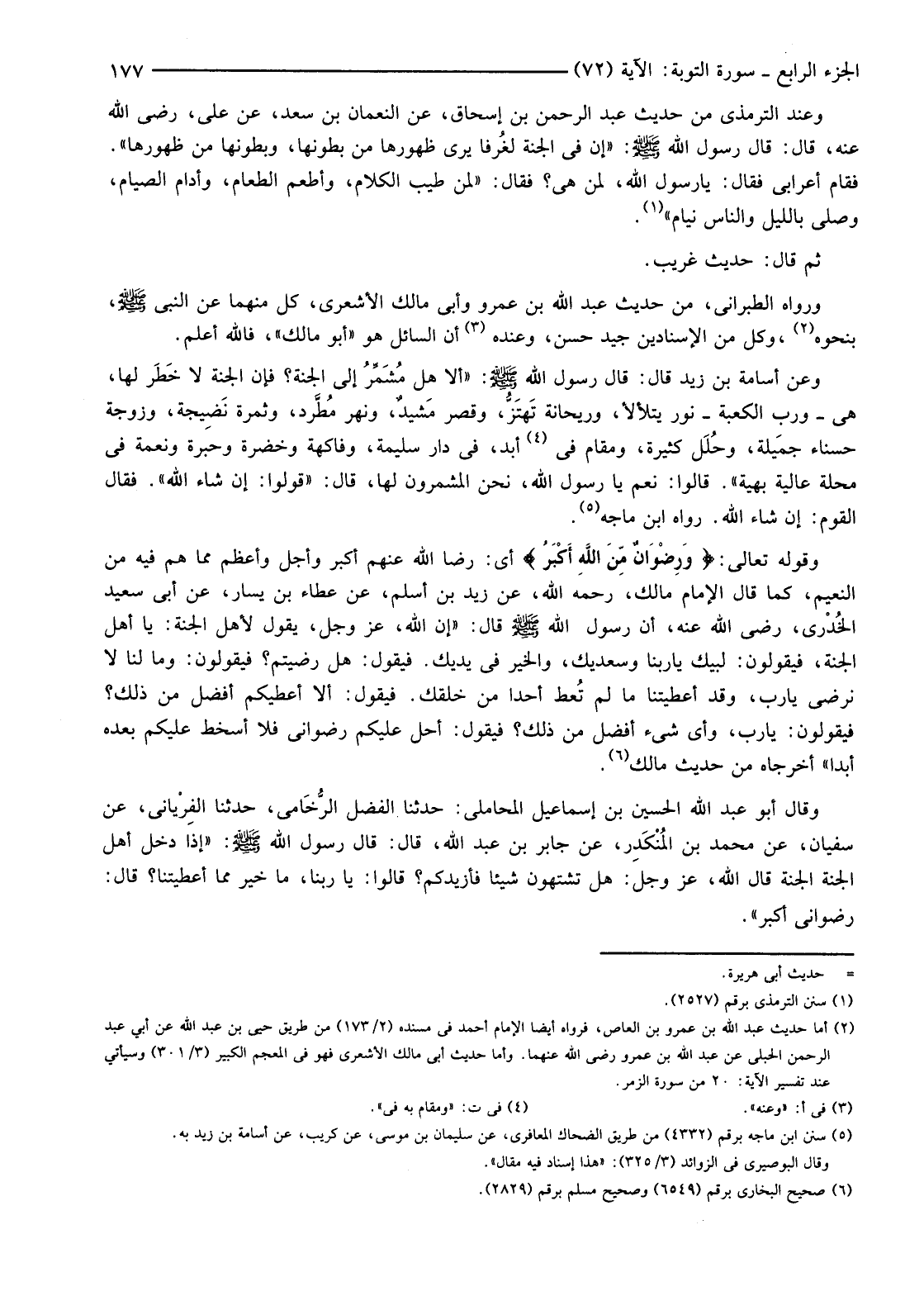 (2) أما حَدِيثِ عَبْدِ اللَّهِ بْنِ عَمْرِو بْنِ الْعَاصِ، فرواه أيضا الإمام أحمد في مسنده (2/173) من طريق حُيَيُّ بْنُ عَبْدِ اللَّهِ عَنْ أَبِي عَبْدِ الرَّحْمَنِ الْحُبُلِيِّ عَنْ عَبْدِ اللَّهِ بْنِ عَمْرٍو رضي الله عنهما. وأما حديث أبي مالك الأشعري فهو في المعجم الكبير (3/301) وسيأتي عند تفسير الآية: 20 من سورة الزمر.