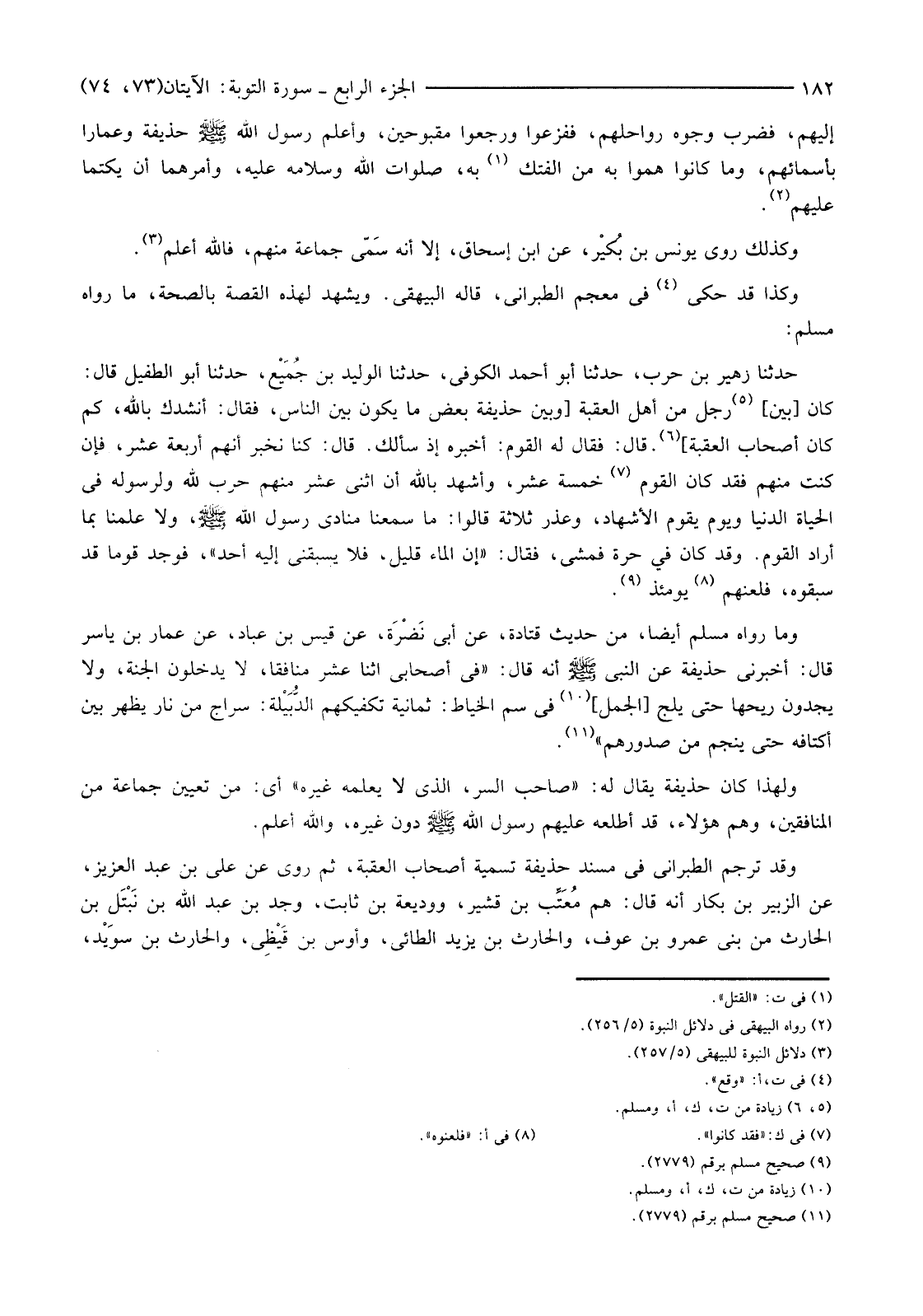 وَلِهَذَا كَانَ حُذَيْفَةُ يُقَالُ لَهُ: "صَاحِبُ السِّرِّ، الَّذِي لَا يَعْلَمُهُ غَيْرُهُ" أَيْ: مِنْ تَعْيِينِ جَمَاعَةٍ مِنَ الْمُنَافِقِينَ، وَهُمْ هَؤُلَاءِ، قَدْ أَطْلَعَهُ عَلَيْهِمْ رَسُولُ اللَّهِ صَلَّى اللَّهُ عَلَيْهِ وَسَلَّمَ دُونَ غَيْرِهِ، واللَّهُ أَعْلَمُ. وَقَدْ تَرْجَمَ الطَّبَرَانِيُّ فِي مُسْنَدِ حُذَيْفَةَ تَسْمِيَةَ أَصْحَابِ الْعَقَبَةِ، ثُمَّ رَوَى عَنْ عَلِيِّ بْنِ عَبْدِ الْعَزِيزِ، عَنِ الزُّبَيْرِ بْنِ بَكَّارٍ أَنَّهُ قَالَ: هُمْ مُعَتِّب بْنُ قُشَيْرٍ، وَوَدِيعَةُ بْنُ ثَابِتٍ، وَجَدُّ بْنُ عَبْدِ اللَّهِ بْنِ نَبْتَل بْنِ الْحَارِثِ مِنْ بَنِي عَمْرِو بْنِ عَوْفٍ، وَالْحَارِثُ بْنُ يَزِيدَ الطَّائِيُّ، وَأَوْسُ بْنُ قَيْظِي، والحارث بن سُوَيْد،
