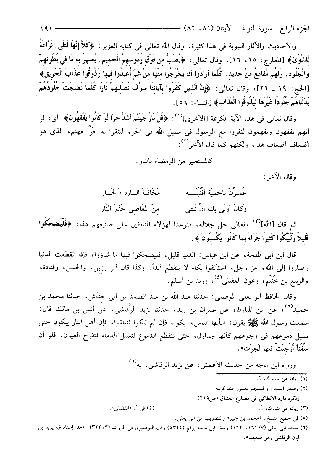 وَقَالَ الْحَافِظُ أَبُو يَعْلَى الْمَوْصِلِيُّ: حَدَّثَنَا عَبْدُ اللَّهِ بْنُ عَبْدِ الصَّمَدِ بْنِ أَبِي خِدَاشٍ، حَدَّثَنَا مُحَمَّدُ بْنُ حُمَيْدٍ (5) عَنِ ابْنِ الْمُبَارَكِ، عَنْ عِمْرَانَ بْنِ زَيْدٍ، حَدَّثَنَا يَزِيدُ الرَّقاشي، عَنْ أَنَسِ بْنِ مَالِكٍ قَالَ: سَمِعْتُ رَسُولَ اللَّهِ صَلَّى اللَّهُ عَلَيْهِ وَسَلَّمَ يَقُولُ: "يَا أَيُّهَا النَّاسُ، ابْكُوا، فَإِنْ لَمْ تَبْكُوا فَتَبَاكَوْا، فَإِنَّ أَهْلَ النَّارِ يَبْكُونَ حَتَّى تَسِيلَ دُمُوعُهُمْ فِي وُجُوهِهِمْ كَأَنَّهَا جَدَاوِلُ، حَتَّى تَنْقَطِعَ الدُّمُوعُ فَتَسِيلَ الدِّمَاءُ فَتَقَرَّحُ الْعُيُونُ. فَلَوْ أَنَّ سُفُنًا أُزْجِيَتْ فِيهَا لَجرَت".