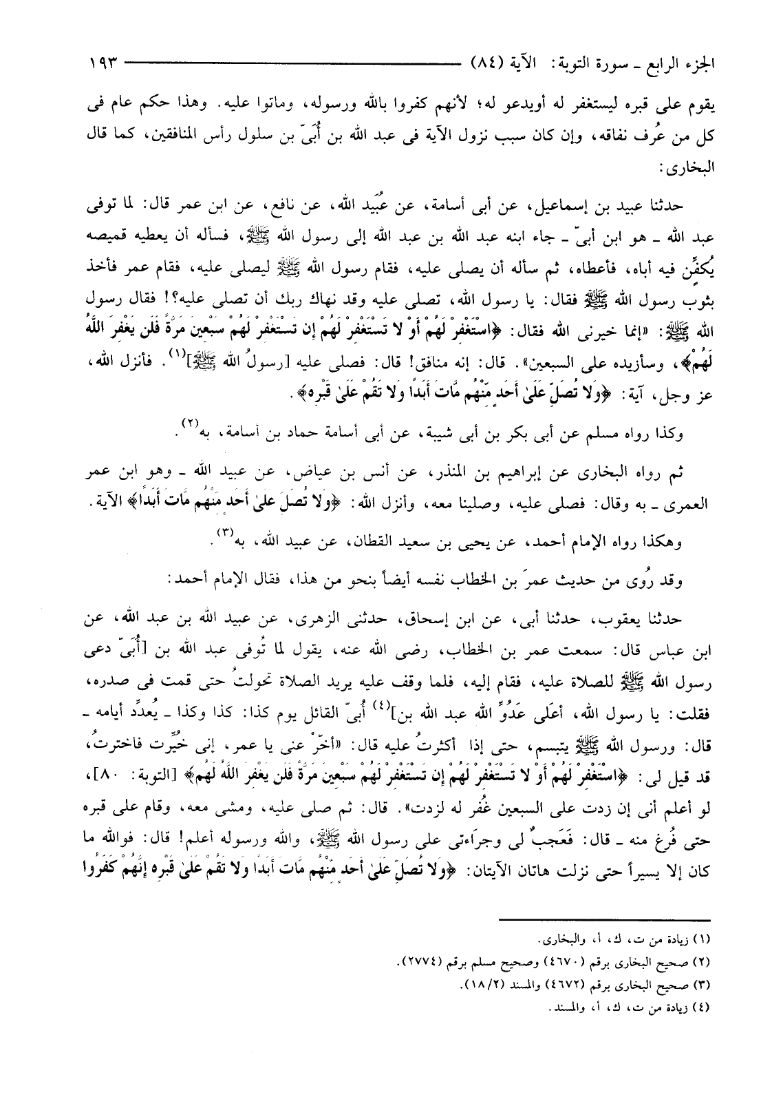 حَدَّثَنَا يَعْقُوبُ، حَدَّثَنَا أَبِي، عَنِ ابْنِ إِسْحَاقَ، حَدَّثَنِي الزُّهْرِيِّ، عَنْ عُبَيْدِ اللَّهِ بْنِ عَبْدِ اللَّهِ، عن ابْنِ عَبَّاسٍ قَالَ: سَمِعْتُ عمرَ بْنَ الْخَطَّابِ، رَضِيَ اللَّهُ عَنْهُ. يَقُولُ لَمَّا تُوفي عَبْدُ اللَّهِ بْنُ [أُبَيٍّ دُعِيَ رَسُولُ اللَّهِ صَلَّى اللَّهُ عَلَيْهِ وَسَلَّمَ لِلصَّلَاةِ عَلَيْهِ، فَقَامَ إِلَيْهِ، فَلَمَّا وَقَفَ عَلَيْهِ يُرِيدُ الصَّلَاةَ تحولتُ حَتَّى قُمْتُ فِي صَدْرِهِ، فَقُلْتُ: يَا رَسُولَ اللَّهِ، أَعَلَى عَدُوِّ اللَّهِ عَبْدِ اللَّهِ بْنِ] (4) أُبَيٍّ الْقَائِلِ يَوْمَ كَذَا: كَذَا وَكَذَا -يُعَدِّد أَيَّامَهُ -قَالَ: وَرَسُولُ اللَّهِ صَلَّى اللَّهُ عَلَيْهِ وَسَلَّمَ يَتَبَسَّمُ، حَتَّى إِذَا أَكْثَرْتُ عَلَيْهِ قَالَ: "أخِّر عَنِّي يَا عُمَرُ، إِنِّي خُيِّرت فاخترتُ، قَدْ قِيلَ لِي: {اسْتَغْفِرْ لَهُمْ أَوْ لَا تَسْتَغْفِرْ لَهُمْ إِنْ تَسْتَغْفِرْ لَهُمْ سَبْعِينَ مَرَّةً فَلَنْ يَغْفِرَ اللَّهُ لَهُمْ} [التَّوْبَةِ:80] لَوْ أَعْلَمُ أَنَّى إِنْ زِدْتُ عَلَى السَّبْعِينَ غُفر لَهُ لَزِدْتُ". قَالَ: ثُمَّ صَلَّى عَلَيْهِ، وَمَشَى مَعَهُ، وَقَامَ عَلَى قَبْرِهِ حَتَّى فُرغ مِنْهُ -قَالَ: فَعَجَبٌ لِي وَجَرَاءَتِي عَلَى رَسُولِ اللَّهِ صَلَّى اللَّهُ عَلَيْهِ وَسَلَّمَ، وَاللَّهُ وَرَسُولُهُ أَعْلَمُ! قَالَ: فَوَاللَّهِ مَا كَانَ إِلَّا يَسِيرًا حَتَّى نَزَلَتْ هَاتَانِ الْآيَتَانِ: {وَلا تُصَلِّ عَلَى أَحَدٍ مِنْهُمْ مَاتَ أَبَدًا وَلا تَقُمْ عَلَى قَبْرِهِ إِنَّهُمْ كَفَرُوا بِاللَّهِ وَرَسُولِهِ وَمَاتُوا وَهُمْ فَاسِقُونَ}