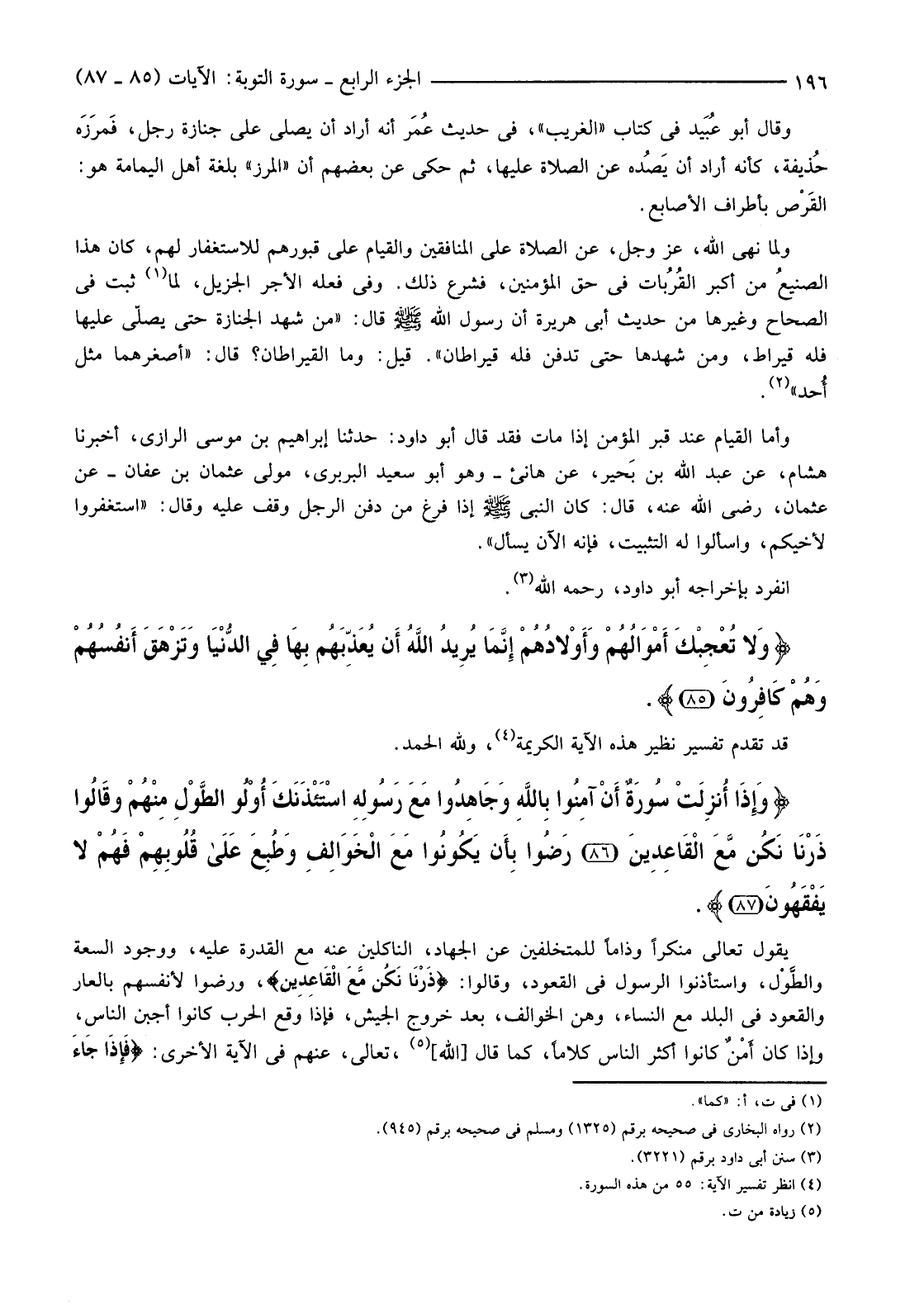 وَلَمَّا نَهَى اللَّهُ، عَزَّ وَجَلَّ، عَنِ الصَّلَاةِ عَلَى الْمُنَافِقِينَ وَالْقِيَامِ عَلَى قُبُورِهِمْ لِلِاسْتِغْفَارِ لَهُمْ، كَانَ هَذَا الصنيعُ مِنْ أَكْبَرِ القُرُبات فِي حَقِّ الْمُؤْمِنِينَ، فَشَرَعَ ذَلِكَ. وَفِي فِعْلِهِ الْأَجْرُ الْجَزِيلُ، لِمَا (1) ثَبَتَ فِي الصِّحَاحِ وَغَيْرِهَا مِنْ حَدِيثِ أَبِي هُرَيْرَةَ أَنَّ رَسُولَ اللَّهِ صَلَّى اللَّهُ عليه وسلم قال: "مَنْ شَهِدَ الْجِنَازَةَ حَتَّى يُصَلِّيَ عَلَيْهَا فَلَهُ قِيرَاطٌ، وَمَنْ شَهِدَهَا حَتَّى تُدْفَنَ فَلَهُ قِيرَاطَانِ". قِيلَ: وَمَا الْقِيرَاطَانِ؟ قَالَ: "أَصْغَرُهُمَا مِثْلُ أُحُدٍ" (2)