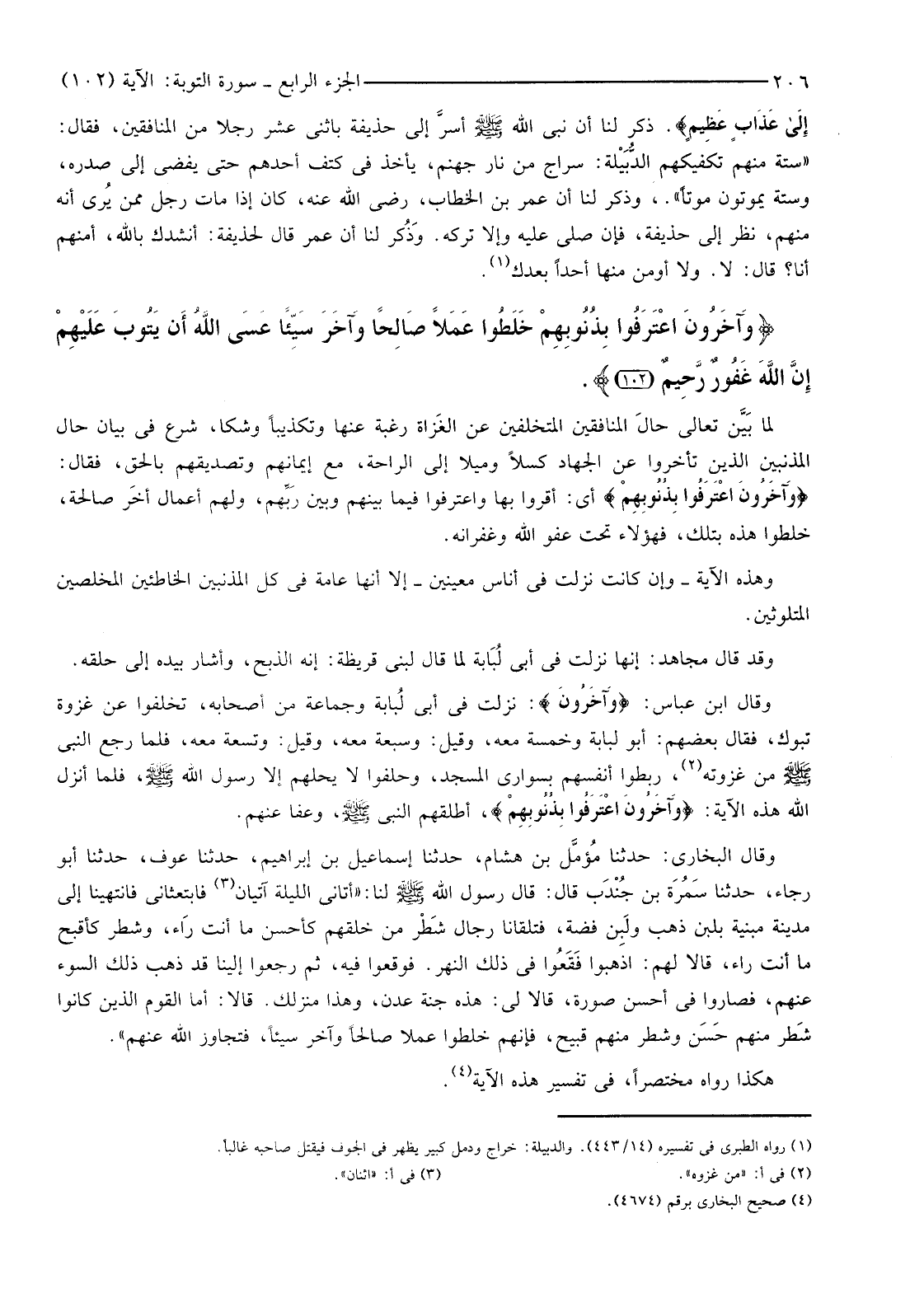 لَمَّا بَيَّن تَعَالَى حَالَ الْمُنَافِقِينَ الْمُتَخَلِّفِينَ عَنِ الغَزاة رَغْبَةً عَنْهَا وَتَكْذِيبًا وَشَكًّا، شَرَعَ فِي بَيَانِ حَالِ الْمُذْنِبِينَ الَّذِينَ تَأَخَّرُوا عَنِ الْجِهَادِ كَسَلًا وَمَيْلًا إِلَى الرَّاحَةِ، مَعَ إِيمَانِهِمْ وَتَصْدِيقِهِمْ بِالْحَقِّ، فَقَالَ: {وَآخَرُونَ اعْتَرَفُوا بِذُنُوبِهِمْ} أَيْ: أَقَرُّوا بِهَا وَاعْتَرَفُوا فِيمَا بَيْنَهُمْ وَبَيْنَ رَبِّهم، وَلَهُمْ أَعْمَالٌ أخرَ صَالِحَةٌ، خَلَطُوا هَذِهِ بِتِلْكَ، فَهَؤُلَاءِ تَحْتَ عَفْوِ اللَّهِ وَغُفْرَانِهِ.