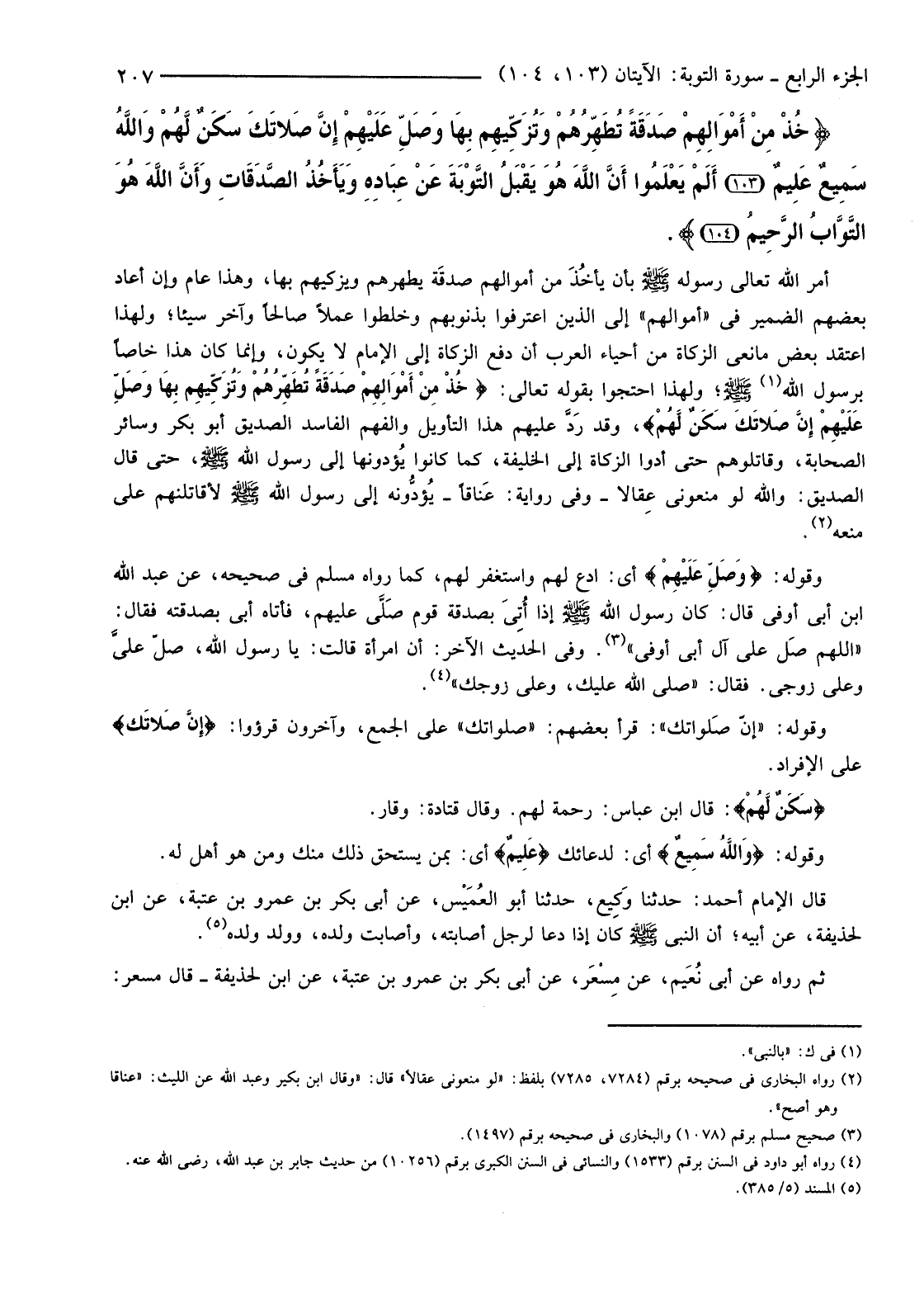 أَمَرَ اللَّهُ تَعَالَى رَسُولَهُ صَلَّى اللَّهُ عَلَيْهِ وَسَلَّمَ بِأَنْ يأخُذَ مِنْ أَمْوَالِهِمْ صدقَة يُطَهِّرُهُمْ وَيُزَكِّيهِمْ بِهَا، وَهَذَا عَامٌّ وَإِنْ أَعَادَ بَعْضُهُمُ الضَّمِيرَ فِي "أَمْوَالِهِمْ" إِلَى الَّذِينَ اعْتَرَفُوا بِذُنُوبِهِمْ وَخَلَطُوا عَمَلًا صَالِحًا وَآخَرَ سَيِّئًا؛ وَلِهَذَا اعْتَقَدَ بَعْضُ مَانِعِي الزَّكَاةِ مِنْ أَحْيَاءِ الْعَرَبِ أَنَّ دَفْعِ الزَّكَاةِ إِلَى الْإِمَامِ لَا يَكُونُ، وَإِنَّمَا كَانَ هَذَا خَاصًّا بِرَسُولِ اللَّهِ (1) صَلَّى اللَّهُ عَلَيْهِ وَسَلَّمَ؛ وَلِهَذَا احْتَجُّوا بِقَوْلِهِ تَعَالَى: {خُذْ مِنْ أَمْوَالِهِمْ صَدَقَةً تُطَهِّرُهُمْ وَتُزَكِّيهِمْ بِهَا وَصَلِّ عَلَيْهِمْ إِنَّ صَلاتَكَ سَكَنٌ لَهُمْ} وَقَدْ رَدَّ عَلَيْهِمْ هَذَا التَّأْوِيلَ وَالْفَهْمَ الْفَاسِدَ الصَّدِيقُ أَبُو بَكْرٍ وَسَائِرُ الصَّحَابَةِ، وَقَاتَلُوهُمْ حَتَّى أَدَّوُا الزَّكَاةَ إِلَى الْخَلِيفَةِ، كَمَا كَانُوا يُؤدونها إِلَى رَسُولِ اللَّهِ صَلَّى اللَّهُ عَلَيْهِ وَسَلَّمَ، حَتَّى قَالَ الصِّدِّيقُ: وَاللَّهِ لَوْ مَنَعُونِي عِقالا -وَفِي رِوَايَةٍ: عَناقًا -يُؤدُّونه إِلَى رَسُولِ اللَّهِ صَلَّى اللَّهُ عَلَيْهِ وَسَلَّمَ لَأُقَاتِلَنَّهُمْ عَلَى مَنْعِهِ. (2)