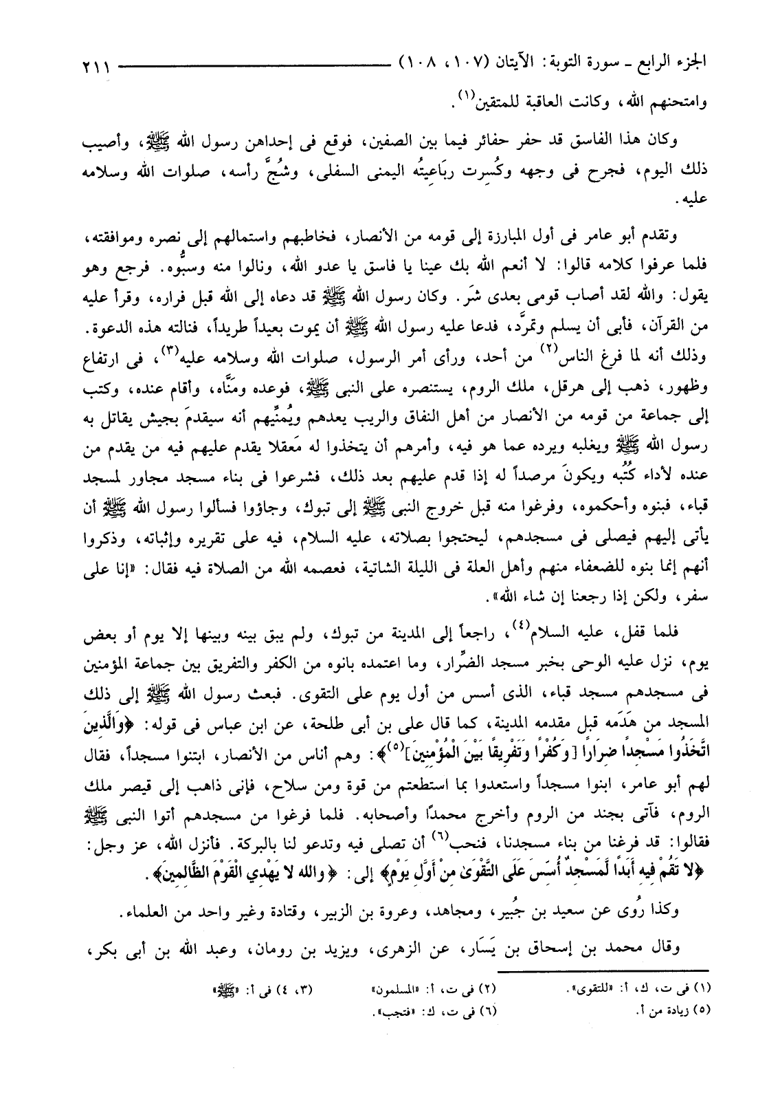 وَذَلِكَ أَنَّهُ لَمَّا فَرَغَ النَّاسُ (2) مِنْ أُحُدٍ، وَرَأَى أَمْرَ الرَّسُولِ، صَلَوَاتُ اللَّهِ وَسَلَامُهُ عَلَيْهِ (3) فِي ارْتِفَاعٍ وَظُهُورٍ، ذَهَبَ إِلَى هِرَقْلَ، مَلِكِ الرُّومِ، يَسْتَنْصِرُهُ عَلَى النَّبِيِّ صَلَّى اللَّهُ عَلَيْهِ وَسَلَّمَ، فَوَعَدَهُ ومَنَّاه، وَأَقَامَ عِنْدَهُ، وَكَتَبَ إِلَى جَمَاعَةٍ مِنْ قَوْمِهِ مِنَ الْأَنْصَارِ مِنْ أَهْلِ النِّفَاقِ وَالرَّيْبِ يَعِدُهُمْ ويُمنَّيهم أَنَّهُ سيقدمُ بِجَيْشٍ يُقَاتِلُ بِهِ رَسُولَ اللَّهِ صَلَّى اللَّهُ عَلَيْهِ وَسَلَّمَ وَيَغْلِبُهُ وَيَرُدُّهُ عَمَّا هُوَ فِيهِ، وَأَمَرَهُمْ أَنْ يَتَّخِذُوا لَهُ مَعقلا يَقْدَمُ عَلَيْهِمْ فِيهِ مَنْ يَقْدَمُ مِنْ عِنْدِهِ لِأَدَاءِ كُتُبه ويكونَ مَرْصَدًا لَهُ إِذَا قَدِمَ عَلَيْهِمْ بَعْدَ ذَلِكَ، فَشَرَعُوا فِي بِنَاءِ مَسْجِدٍ مُجَاوِرٍ لِمَسْجِدِ قُبَاءٍ، فَبَنَوْهُ وَأَحْكَمُوهُ، وَفَرَغُوا مِنْهُ قَبْلَ خُرُوجِ النَّبِيِّ صَلَّى اللَّهُ عَلَيْهِ وَسَلَّمَ إِلَى تَبُوكَ، وَجَاءُوا فَسَأَلُوا رَسُولَ اللَّهِ صَلَّى اللَّهُ عَلَيْهِ وَسَلَّمَ أَنْ يَأْتِيَ إِلَيْهِمْ فَيُصَلِّيَ فِي مَسْجِدِهِمْ، لِيَحْتَجُّوا بِصَلَاتِهِ، عَلَيْهِ السَّلَامُ، فِيهِ عَلَى تَقْرِيرِهِ وَإِثْبَاتِهِ، وَذَكَرُوا أَنَّهُمْ إِنَّمَا بَنَوْهُ لِلضُّعَفَاءِ مِنْهُمْ وَأَهْلِ الْعِلَّةِ فِي اللَّيْلَةِ الشَّاتِيَةِ، فَعَصَمَهُ اللَّهُ مِنَ الصَّلَاةِ فِيهِ فَقَالَ: "إِنَّا عَلَى سَفَرٍ، وَلَكِنْ إِذَا رَجَعْنَا إِنْ شَاءَ اللَّهُ".