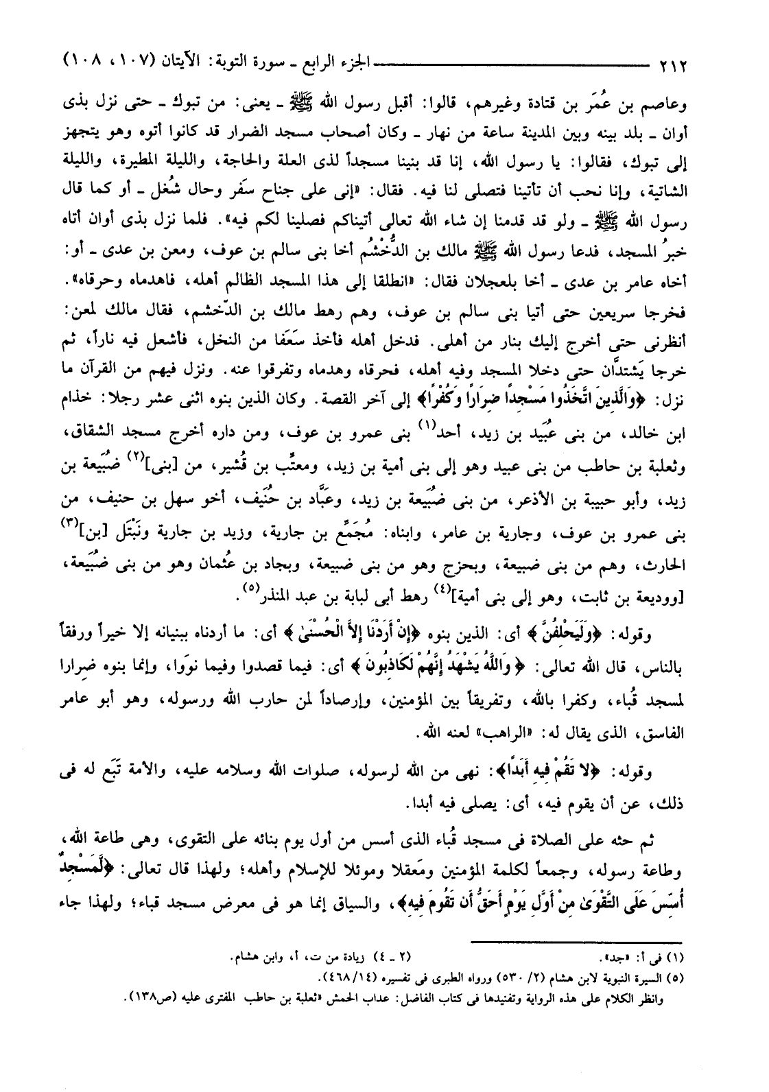 وعاصم بن عُمَر بن قتادة وغيرهم، قالوا: أَقْبَلَ رَسُولُ اللَّهِ صَلَّى اللَّهُ عَلَيْهِ وَسَلَّمَ -يَعْنِي: مِنْ تَبُوكَ -حَتَّى نَزَلَ بِذِي أَوَانٍ -بَلَدٌ بَيْنَهُ وَبَيْنَ الْمَدِينَةِ سَاعَةٌ مِنْ نَهَارٍ -وَكَانَ أَصْحَابُ مَسْجِدِ الضِّرَارِ قَدْ كَانُوا أَتَوْهُ وَهُوَ يَتَجَهَّزُ إِلَى تَبُوكَ، فَقَالُوا: يَا رَسُولَ اللَّهِ، إِنَّا قَدْ بَنَيْنَا مَسْجِدًا لِذِي الْعِلَّةِ وَالْحَاجَةِ، وَاللَّيْلَةِ الْمَطِيرَةِ، وَاللَّيْلَةِ الشَّاتِيَةِ، وَإِنَّا نُحِبُّ أَنْ تَأْتِيَنَا فَتُصِلِّيَ لَنَا فِيهِ. فَقَالَ: "إِنِّي عَلَى جَنَاحِ سَفر وَحَالِ شُغل -أَوْ كَمَا قَالَ رَسُولُ اللَّهِ صَلَّى اللَّهُ عَلَيْهِ وَسَلَّمَ -وَلَوْ قَدْ قَدِمْنَا إِنْ شَاءَ اللَّهُ تَعَالَى أَتَيْنَاكُمْ فَصَلَّيْنَا لَكُمْ فِيهِ". فَلَمَّا نَزَلَ بِذِي أَوَانٍ أَتَاهُ خبرُ الْمَسْجِدِ، فَدَعَا رَسُولُ اللَّهِ صَلَّى اللَّهُ عَلَيْهِ وَسَلَّمَ مَالِكَ بْنَ الدُّخْشُم أَخَا بَنِي سَالِمِ بْنِ عَوْفٍ، وَمَعْنَ بْنَ عَدِيٍّ -أَوْ: أَخَاهُ عَامِرِ بْنِ عَدِيٍّ -أَخَا بَلْعِجْلَانَ فَقَالَ: "انْطَلِقَا إِلَى هَذَا الْمَسْجِدِ الظَّالِمِ أَهْلُهُ، فَاهْدِمَاهُ وَحَرِّقَاهُ". فَخَرَجَا سَرِيعَيْنِ حَتَّى أَتَيَا بَنِي سَالِمِ بْنِ عَوْفٍ، وَهُمْ رَهْطُ مَالِكِ بْنِ الدُّخْشُمَ، فَقَالَ مَالِكٌ لِمَعْنٍ: أَنْظِرْنِي حَتَّى أَخْرُجَ إِلَيْكَ بِنَارٍ مِنْ أَهْلِي. فَدَخَلَ أَهْلَهُ فَأَخَذَ سَعَفا مِنَ النَّخْلِ، فَأَشْعَلَ فِيهِ نَارًا، ثُمَّ خَرَجَا يَشتدَّان حَتَّى دَخَلَا الْمَسْجِدَ وَفِيهِ أَهْلُهُ، فَحَرَقَاهُ وَهَدَمَاهُ وَتَفَرَّقُوا عَنْهُ. وَنَزَلَ فِيهِمْ مِنَ الْقُرْآنِ مَا نَزَلَ: {وَالَّذِينَ اتَّخَذُوا مَسْجِدًا ضِرَارًا وَكُفْرًا} إِلَى آخِرِ الْقِصَّةِ. وَكَانَ الَّذِينَ بَنَوْهُ اثْنَيْ عَشَرَ رَجُلًا خُذَامُ بْنُ خَالِدٍ، مِنْ بَنِي عُبَيد بْنِ زَيْدٍ، أَحَدُ (1) بَنِي عَمْرِو بْنِ عَوْفٍ، وَمِنْ دَارِهِ أُخْرِجَ مَسْجِدُ الشِّقَاقِ، وَثَعْلَبَةُ بْنُ حَاطِبٍ مِنْ بَنِي عُبَيْدٍ وَهُوَ إِلَى بَنِي أُمَيَّةَ بْنِ زَيْدٍ، ومعتِّب بْنُ قُشير، مِنْ [بَنِي] (2) ضُبَيعة بْنِ زَيْدٍ، وَأَبُو حَبِيبَةَ بْنُ الْأَذْعَرِ، مِنْ بَنِي ضُبَيعة بْنِ زَيْدٍ، وعَبَّاد بْنُ حُنَيف، أَخُو سَهْلِ بْنِ حُنَيْفٍ، مِنْ بَنِي عَمْرِو بْنِ عَوْفٍ، وَجَارِيَةُ بْنُ عَامِرٍ، وَابْنَاهُ: مُجَمِّع بْنُ جَارِيَةَ، وَزَيْدُ بْنُ جَارِيَةَ ونَبْتَل [بْنُ] (3) الْحَارِثِ، وَهُمْ مِنْ بَنِي ضُبَيْعَةَ، وَبَحْزَجٌ وَهُوَ مِنْ بَنِي ضُبَيْعَةَ، وَبِجَادُ بْنُ عُثمان وَهُوَ مِنْ بَنِي ضُبَيعة، [وَوَدِيعَةُ بْنُ ثَابِتٍ، وَهُوَ إِلَى بَنِي أُمَيَّةَ] (4) رَهْطُ أَبِي لَبَابَةَ بْنِ عَبْدِ الْمُنْذِرِ. (5)