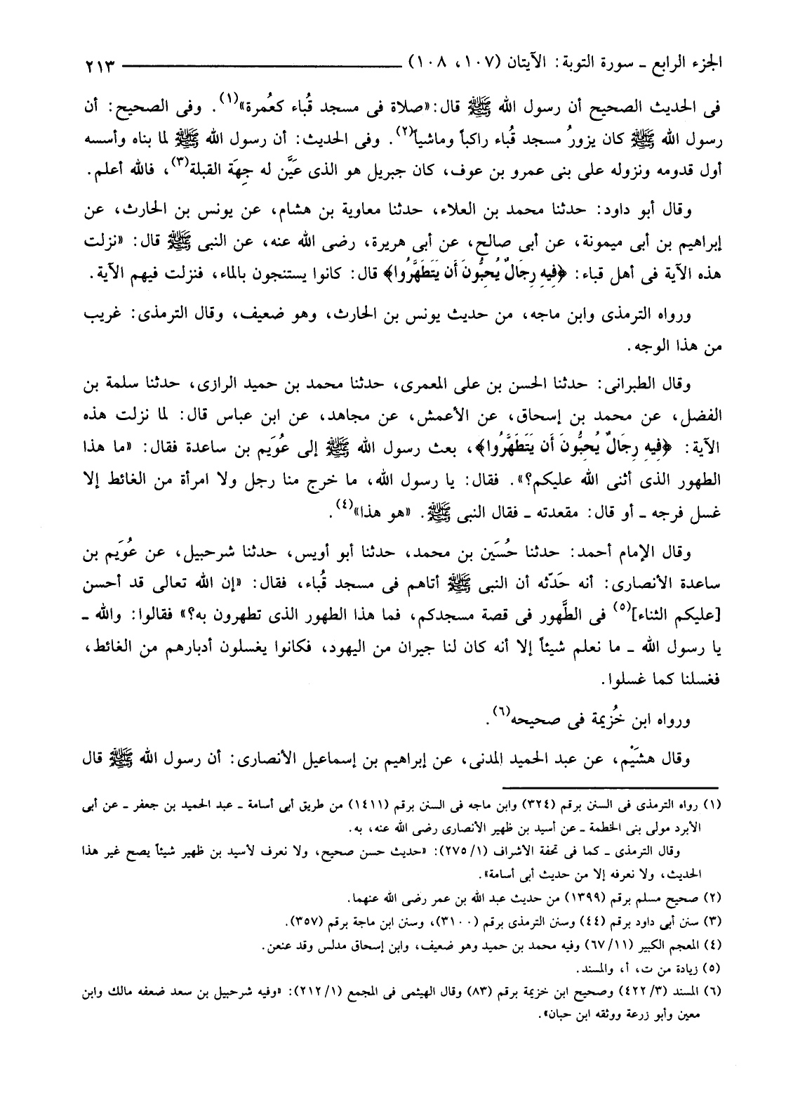 وَقَالَ الطَّبَرَانِيُّ: حَدَّثَنَا الْحَسَنُ بْنُ عَلِيٍّ الْمَعْمَرِيُّ، حَدَّثَنَا مُحَمَّدُ بْنُ حُمَيْدٍ الرَّازِيُّ، حَدَّثَنَا سَلَمَةُ بْنُ الْفَضْلِ، عَنْ مُحَمَّدِ بْنِ إِسْحَاقَ، عَنِ الْأَعْمَشِ، عَنْ مُجَاهِدٍ، عَنِ ابْنِ عَبَّاسٍ قَالَ: لَمَّا نَزَلَتْ هَذِهِ الْآيَةُ: {فِيهِ رِجَالٌ يُحِبُّونَ أَنْ يَتَطَهَّرُوا} بَعَثَ رَسُولُ اللَّهِ صَلَّى اللَّهُ عَلَيْهِ وَسَلَّمَ إِلَى عُوَيم بْنِ سَاعِدَةَ فَقَالَ: "مَا هَذَا الطَّهُورُ الَّذِي أَثْنَى اللَّهُ عَلَيْكُمْ؟ ". فَقَالَ: يَا رَسُولَ اللَّهِ، مَا خَرَجَ مِنَّا رَجُلٌ وَلَا امْرَأَةٌ مِنَ الْغَائِطِ إِلَّا غَسَلَ فَرْجَهُ -أَوْ قَالَ: مَقْعَدَتَهُ -فَقَالَ النَّبِيُّ صَلَّى اللَّهُ عَلَيْهِ وَسَلَّمَ. "هُوَ هَذَا". (4)