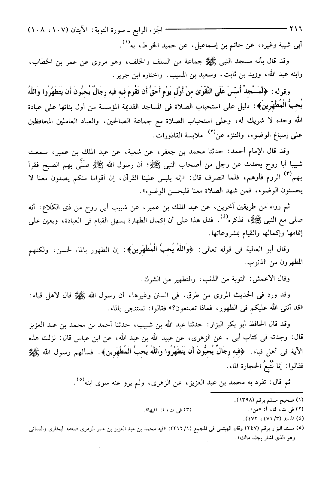وَقَدْ قَالَ الْحَافِظُ أَبُو بَكْرٍ الْبَزَّارُ: حَدَّثَنَا عَبْدُ اللَّهِ بْنُ شَبِيبٍ، حَدَّثَنَا أَحْمَدُ بْنُ مُحَمَّدِ بْنِ عَبْدِ الْعَزِيزِ قَالَ: وَجَدْتُهُ فِي كِتَابِ أَبِي، عَنِ الزُّهْرِيِّ، عَنْ عُبَيْدِ اللَّهِ بْنِ عَبْدِ اللَّهِ، عَنِ ابْنِ عَبَّاسٍ قَالَ: نَزَلَتْ هَذِهِ الْآيَةُ فِي أَهْلِ قُبَاءٍ. {فِيهِ رِجَالٌ يُحِبُّونَ أَنْ يَتَطَهَّرُوا وَاللَّهُ يُحِبُّ الْمُطَّهِّرِينَ} فَسَأَلَهُمْ رَسُولَ اللَّهِ صَلَّى اللَّهُ عَلَيْهِ وَسَلَّمَ فَقَالُوا: إِنَّا نُتْبِعُ الْحِجَارَةَ الْمَاءَ.
