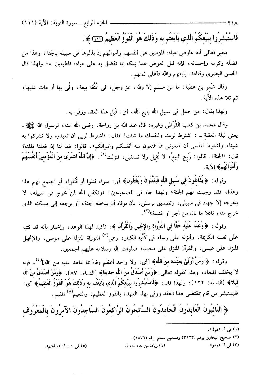 {إِنَّ اللَّهَ اشْتَرَى مِنَ الْمُؤْمِنِينَ أَنْفُسَهُمْ وَأَمْوَالَهُمْ بِأَنَّ لَهُمُ الْجَنَّةَ يُقَاتِلُونَ فِي سَبِيلِ اللَّهِ فَيَقْتُلُونَ وَيُقْتَلُونَ وَعْدًا عَلَيْهِ حَقًّا فِي التَّوْرَاةِ وَالإنْجِيلِ وَالْقُرْآنِ وَمَنْ أَوْفَى بِعَهْدِهِ مِنَ اللَّهِ فَاسْتَبْشِرُوا بِبَيْعِكُمُ الَّذِي بَايَعْتُمْ بِهِ وَذَلِكَ هُوَ الْفَوْزُ الْعَظِيمُ (111) }