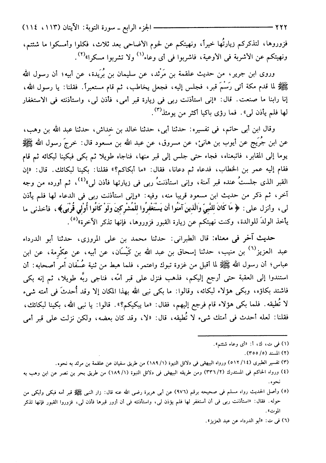 (5) وأصل الحديث رواه مسلم في صحيحه برقم (976) عَنْ أَبِي هُرَيْرَةَ رَضِيَ اللَّهُ عَنْهُ قَالَ: زار النبي صلى الله عليه وسلم قبر أمه فبكى وأبكى من حوله. فقال: "استأذنت ربي في أن أستغفر لها فلم يؤذن لي، واستأذنته في أن أزور قبرها فأذن لي، فزوروا القبور فإنها تذكر الموت".