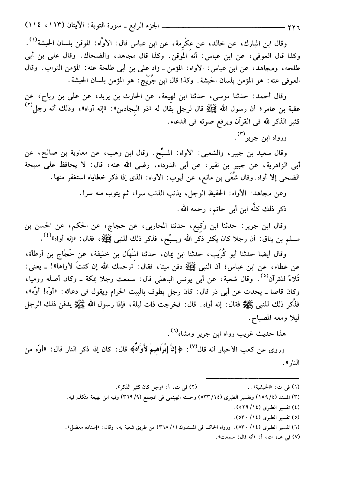 وَقَالَ ابْنُ الْمُبَارَكِ، عَنْ خَالِدٍ، عَنْ عِكْرِمة، عَنِ ابْنِ عَبَّاسٍ قَالَ: الأوَّاه: الْمُوقِنُ بِلِسَانِ الْحَبَشَةِ. (1) وَكَذَا قَالَ الْعَوْفِيُّ، عَنِ ابْنِ عَبَّاسٍ: أَنَّهُ الْمُوقِنُ. وَكَذَا قَالَ مُجَاهِدٌ، وَالضَّحَّاكُ. وَقَالَ عَلِيُّ بْنُ أَبِي طَلْحَةَ، وَمُجَاهِدٌ، عَنِ ابْنِ عَبَّاسٍ: الْأَوَّاهُ: الْمُؤْمِنُ -زَادَ عَلِيُّ بْنُ أَبِي طَلْحَةَ عَنْهُ: الْمُؤْمِنُ التَّوَّابُ. وَقَالَ الْعَوْفِيُّ عَنْهُ: هُوَ الْمُؤْمِنُ بِلِسَانِ الْحَبَشَةِ. وَكَذَا قَالَ ابْنُ جُرَيْج: هُوَ الْمُؤْمِنُ بِلِسَانِ الْحَبَشَةِ.