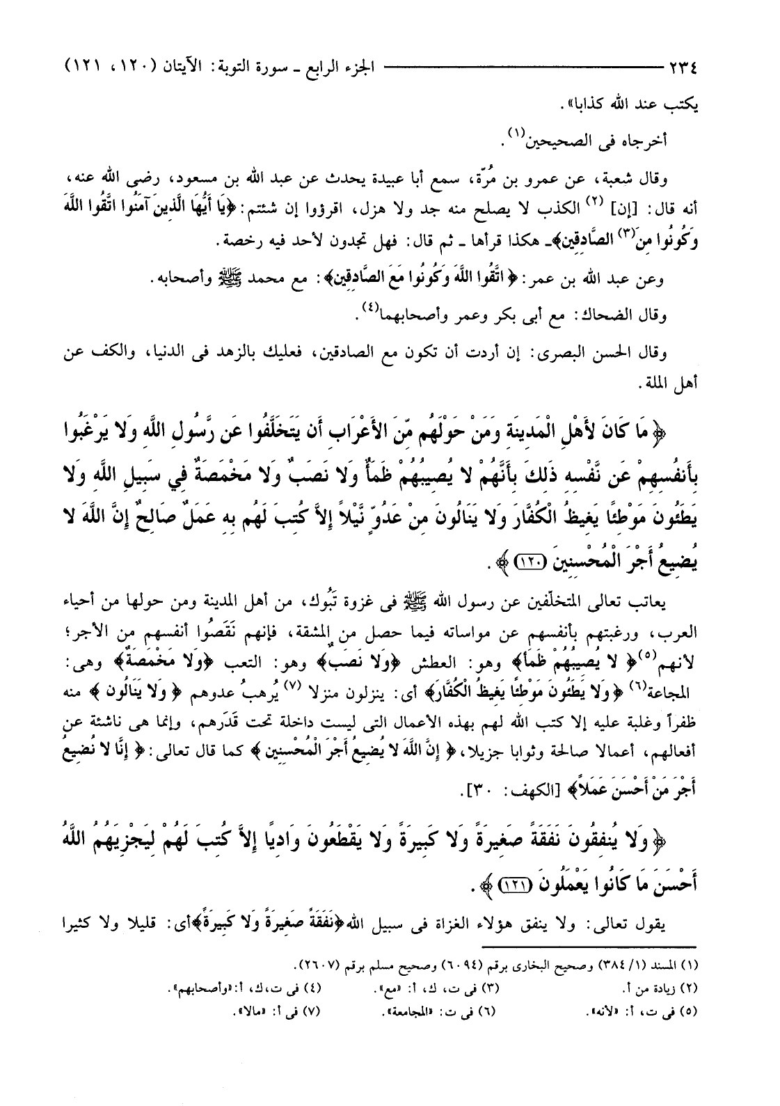 {مَا كَانَ لأهْلِ الْمَدِينَةِ وَمَنْ حَوْلَهُمْ مِنَ الأعْرَابِ أَنْ يَتَخَلَّفُوا عَنْ رَسُولِ اللَّهِ وَلا يَرْغَبُوا بِأَنْفُسِهِمْ عَنْ نَفْسِهِ ذَلِكَ بِأَنَّهُمْ لَا يُصِيبُهُمْ ظَمَأٌ وَلا نَصَبٌ وَلا مَخْمَصَةٌ فِي سَبِيلِ اللَّهِ وَلا يَطَئُونَ مَوْطِئًا يَغِيظُ الْكُفَّارَ وَلا يَنَالُونَ مِنْ عَدُوٍّ نَيْلا إِلا كُتِبَ لَهُمْ بِهِ عَمَلٌ صَالِحٌ إِنَّ اللَّهَ لَا يُضِيعُ أَجْرَ الْمُحْسِنِينَ (120) }