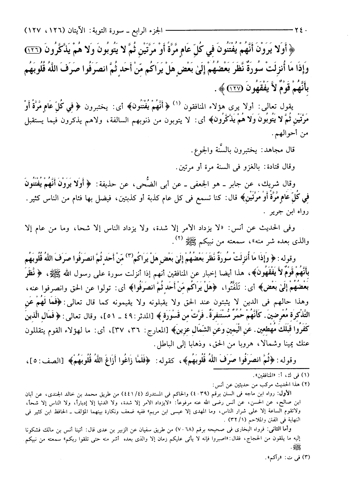 {أَوَلا يَرَوْنَ أَنَّهُمْ يُفْتَنُونَ فِي كُلِّ عَامٍ مَرَّةً أَوْ مَرَّتَيْنِ ثُمَّ لَا يَتُوبُونَ وَلا هُمْ يَذَّكَّرُونَ (126) وَإِذَا مَا أُنزلَتْ سُورَةٌ نَظَرَ بَعْضُهُمْ إِلَى بَعْضٍ هَلْ يَرَاكُمْ مِنْ أَحَدٍ ثُمَّ انْصَرَفُوا صَرَفَ اللَّهُ قُلُوبَهُمْ بِأَنَّهُمْ قَوْمٌ لَا يَفْقَهُونَ (127) }