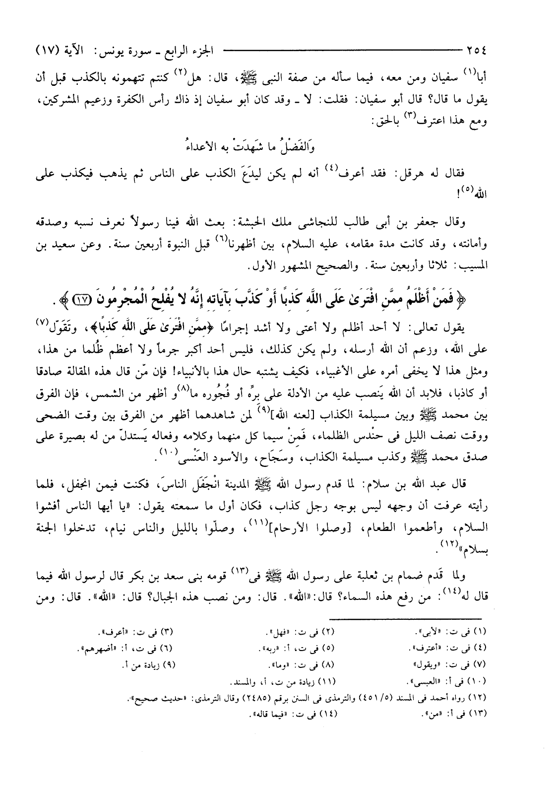 أَبَا (1) سُفْيَانَ وَمَنْ مَعَهُ، فِيمَا سَأَلَهُ مِنْ صِفَةِ النَّبِيِّ صَلَّى اللَّهُ عَلَيْهِ وَسَلَّمَ، قَالَ: هَلْ (2) كُنْتُمْ تَتَّهِمُونَهُ بِالْكَذِبِ قَبْلَ أَنْ يَقُولَ مَا قَالَ؟ قَالَ أَبُو سُفْيَانَ: فَقُلْتُ: لَا -وَقَدْ كَانَ أَبُو سُفْيَانَ إِذْ ذَاكَ رَأْسَ الْكَفَرَةِ وَزَعِيمَ الْمُشْرِكِينَ، وَمَعَ هَذَا اعْتَرَفَ (3) بِالْحَقِّ: