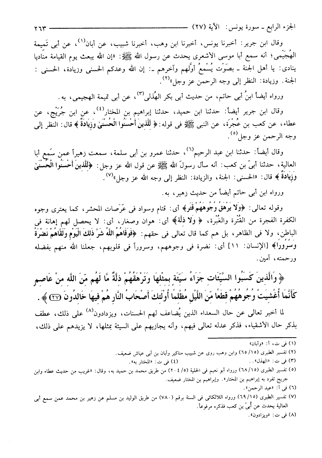 (7) تفسير الطبري (15/69) ورواه اللالكائي في السنة برقم (780) من طرق الوليد بن مسلم عن زهير بن محمد عمن سمع أبا العالية يحدث عن أبي بن كعب فذكره مرفوعا.